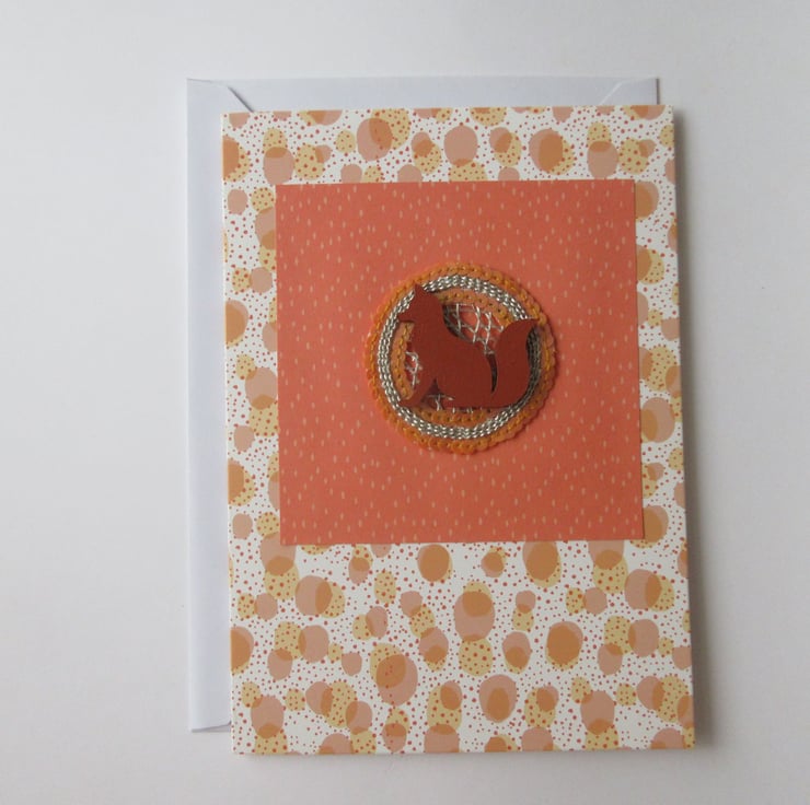 The card blank has a decorative print on it, which has been topped with co-ordinating craft paper, a sequin motif, and a hand painted wooden fox.
