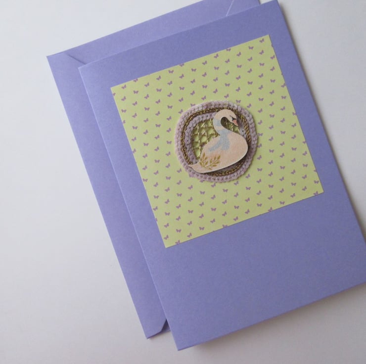 The card blank has a decorative print on it, which has been topped with co-ordinating craft paper, a sequin motif, and a wooden swan.