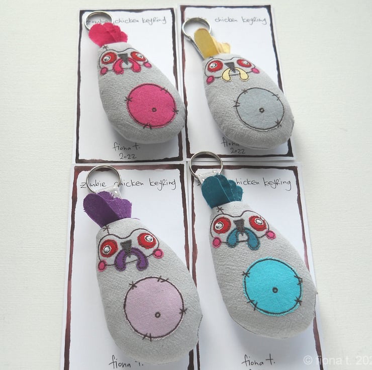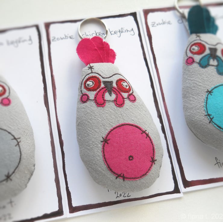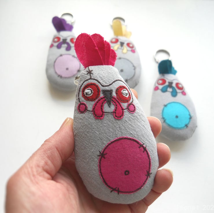 these befuddled little fabric zombie chickens measure about 10cm (4inches) tall / 14cm (5.5”) including comb, hanging loop & split ring.