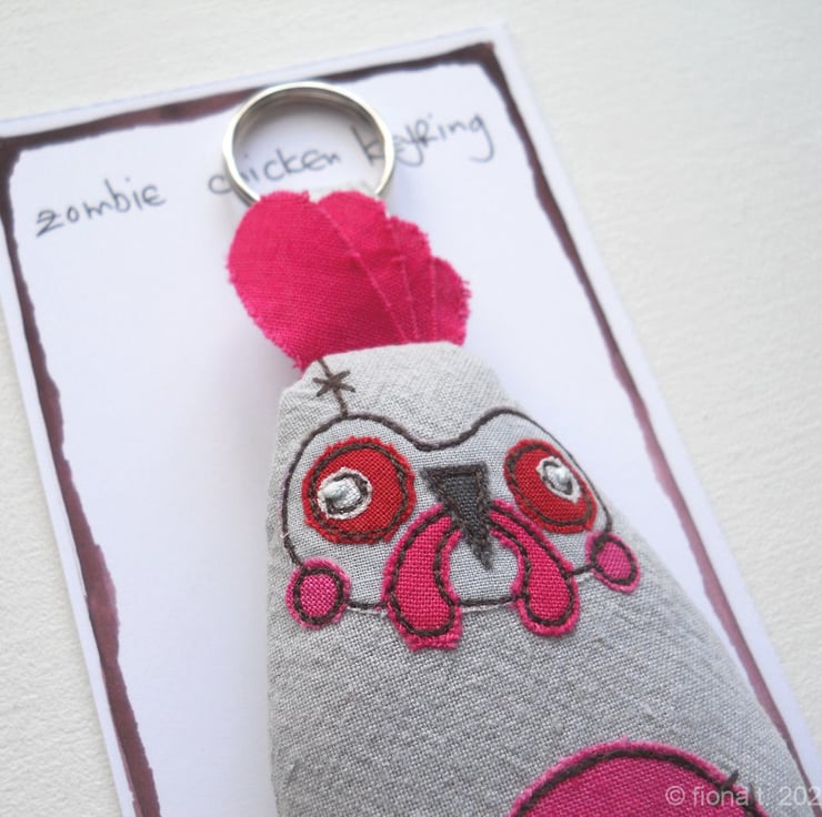 freehand embroidered zombie chicken bag charm or keyring - PINK