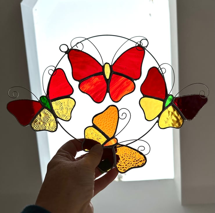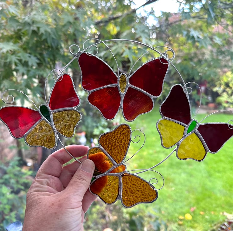 This suncatcher consists of four butterflies, made from red and amber stained glass that have some beautiful textures.