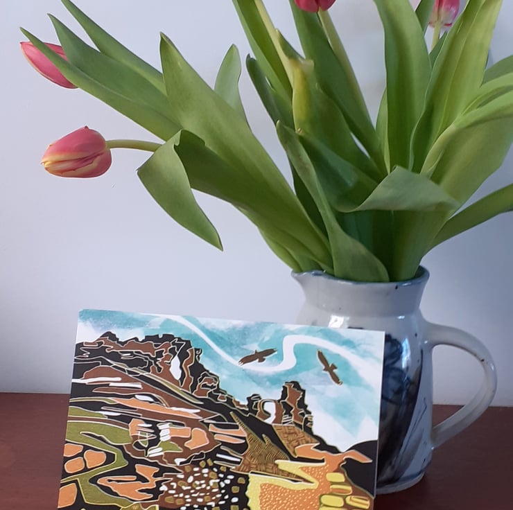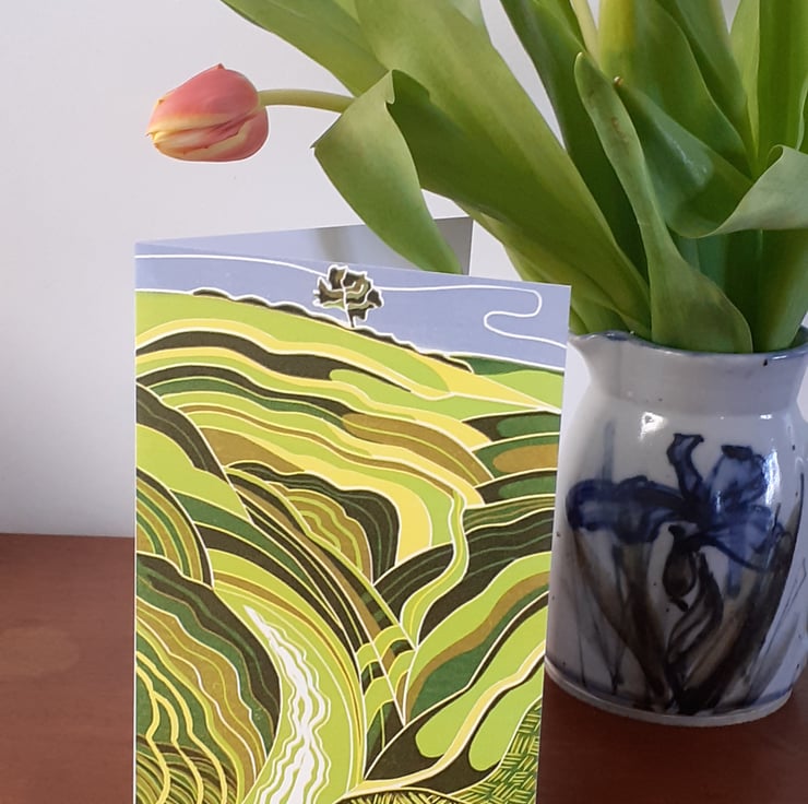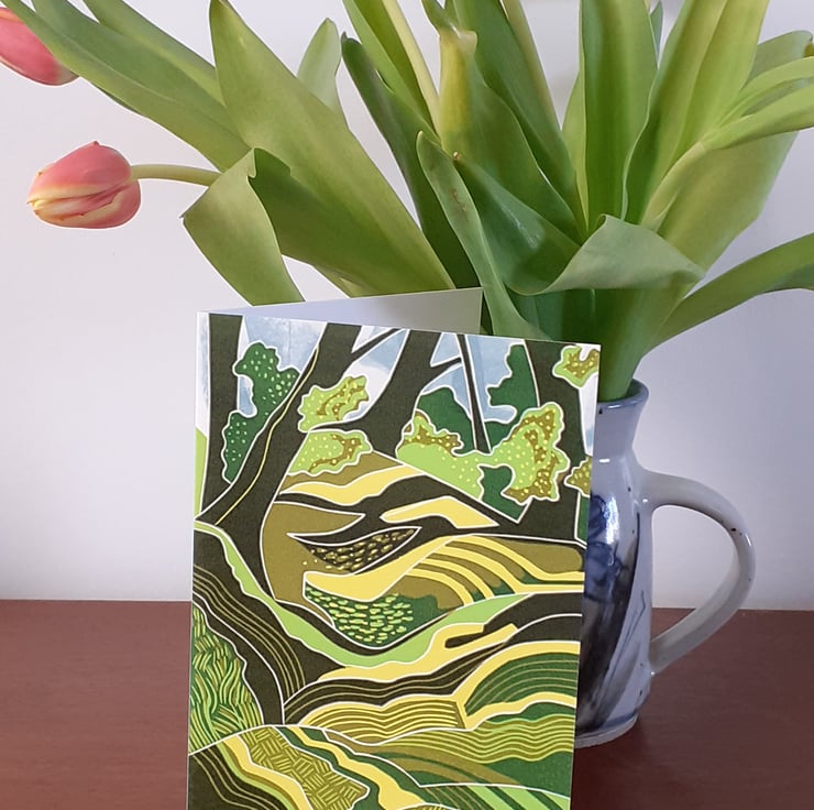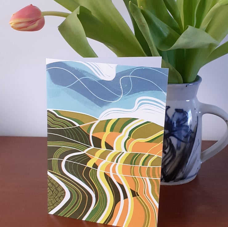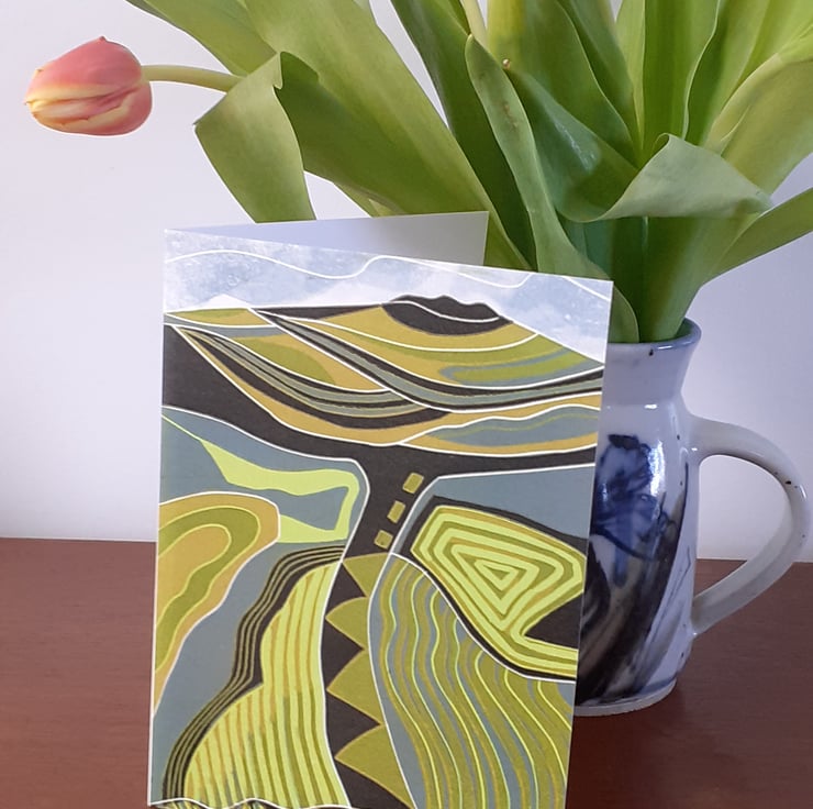 A mixed pack of six blank, colourful, landscape design greetings cards with envelopes. Printed on quality card, reproduced from my own lino cut images.