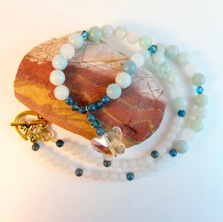 The necklace is made of 6mm Amazonite beads that are varying shades of pastel sea-greens, interspersed with 6mm frosted white jade and 4mm Swarovski "indicolite" bicones.