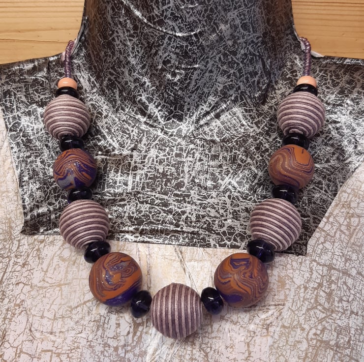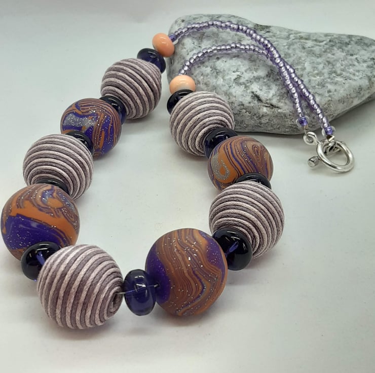 An exclusive necklace featuring large handmade polymer clay beads in a tangerine, purple and silver swirl design with a hint of sparkle.