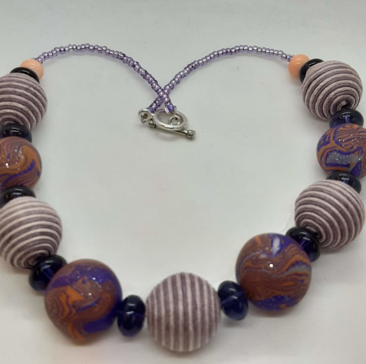 The handmade beads measure between 20.2mm and 23.3mm with 22mm purple and cream coiled fabric beads with 12.8mm purple glass flat spacer beads in between; small seed beads complete this unique and stunning necklace.