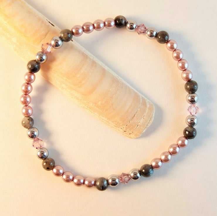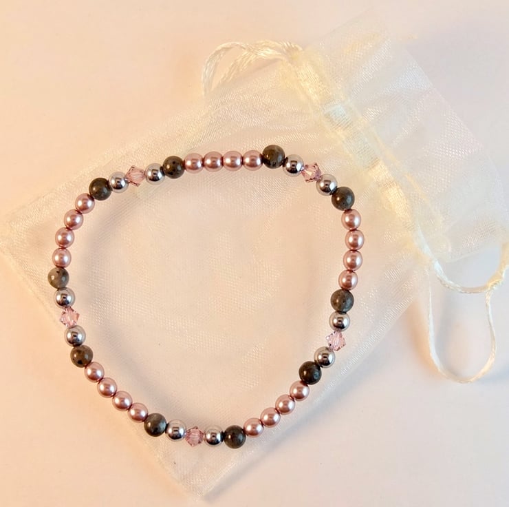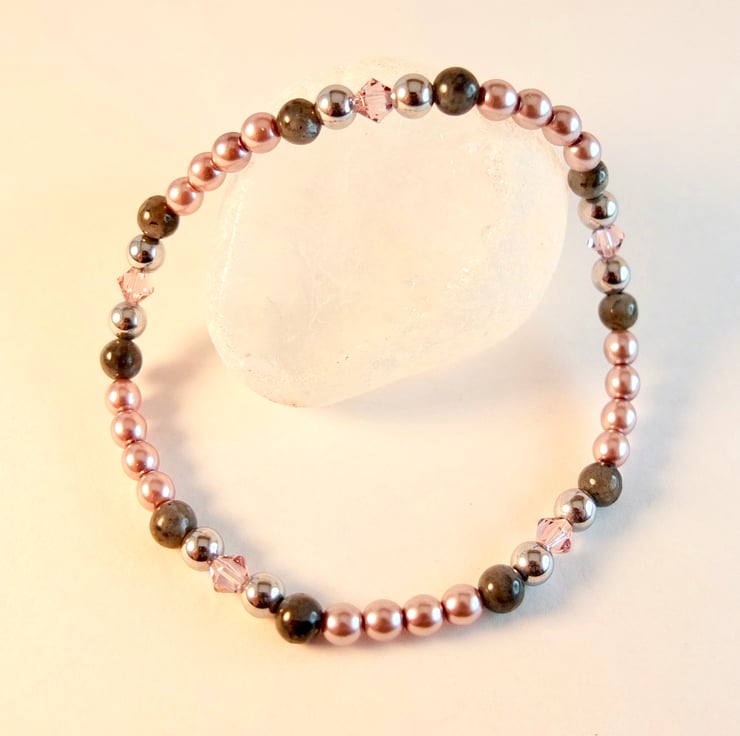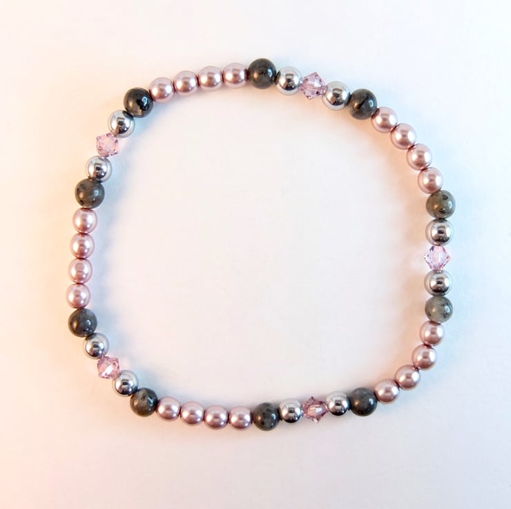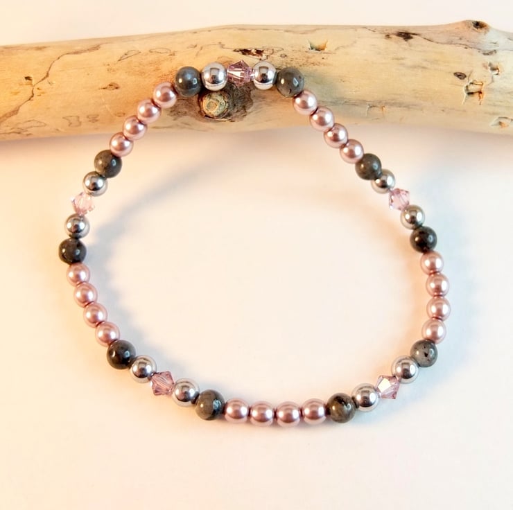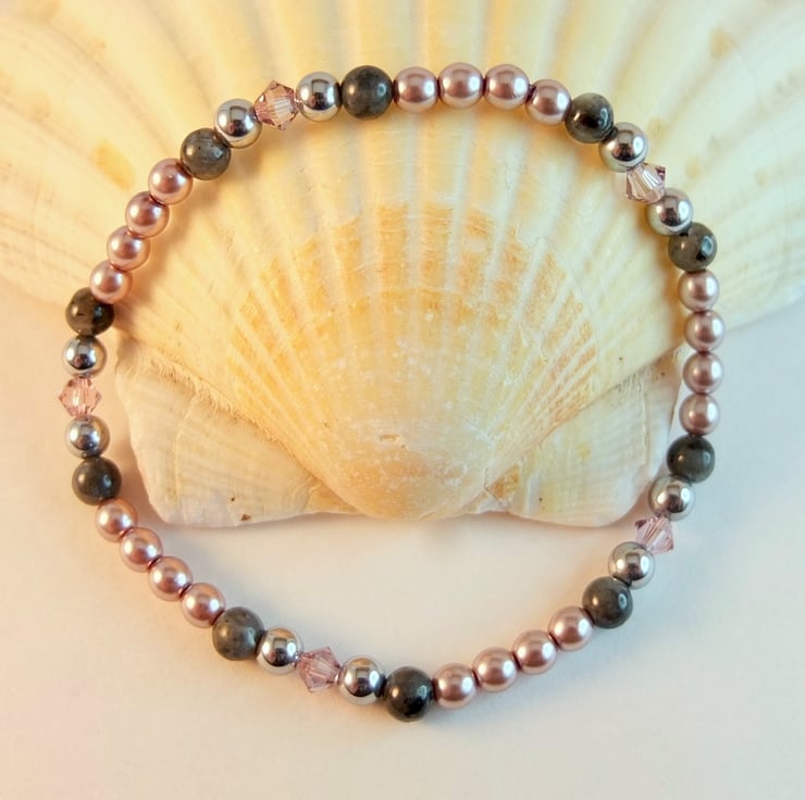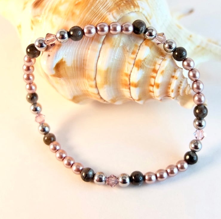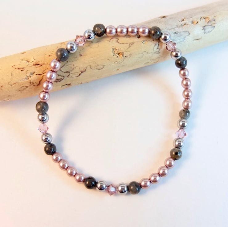 A pretty, sparkly, dainty stretch bracelet of 4mm dusky mauve Czech glass pearls, larvikite, silver hematite and Swarovski "light amethyst" crystals.