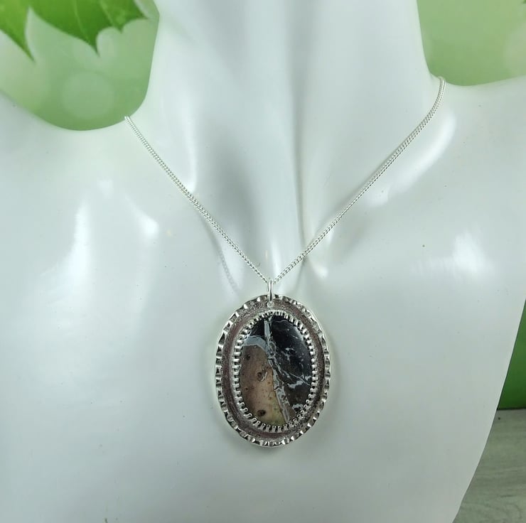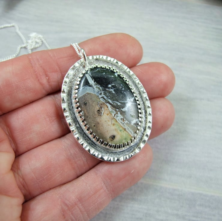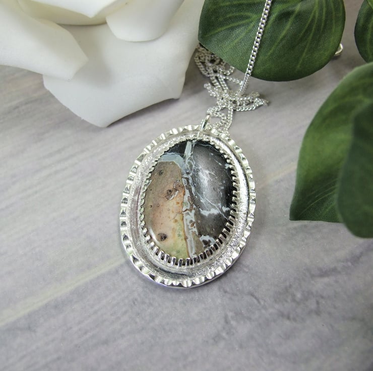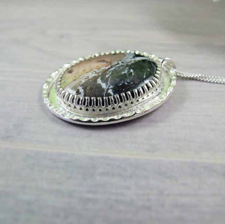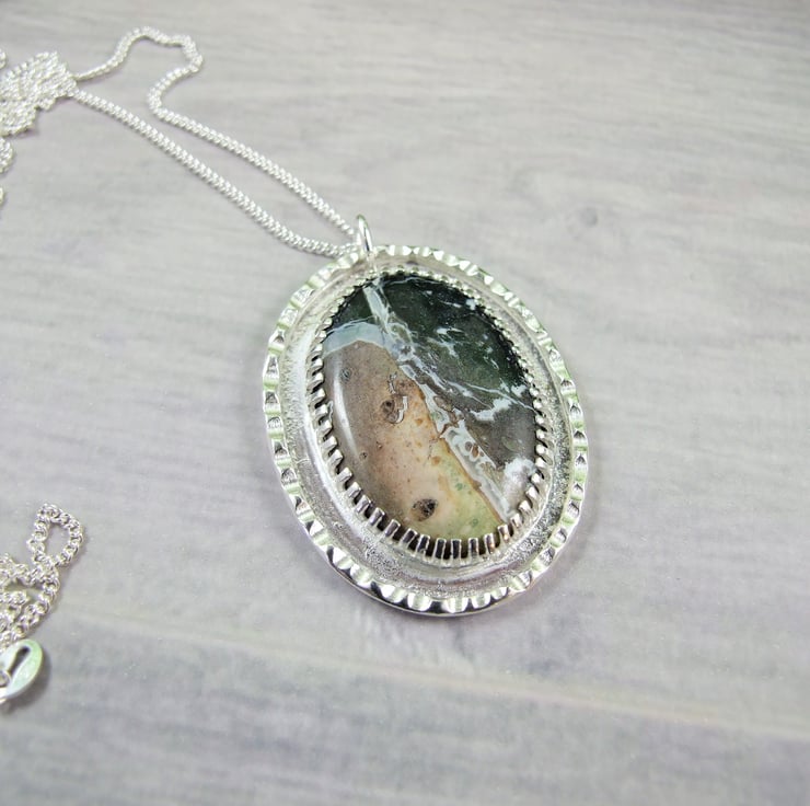 Large Gemstone Pendant. Sterling Silver and Rainforest Jasper.