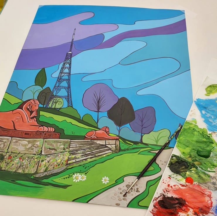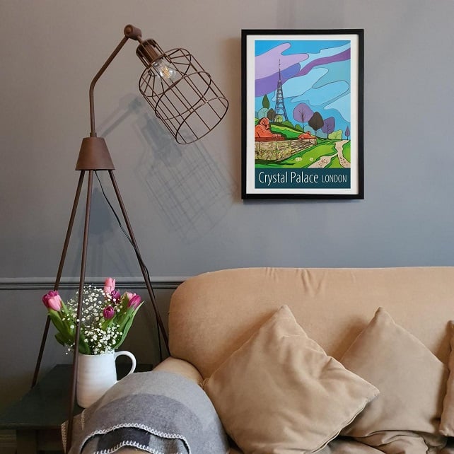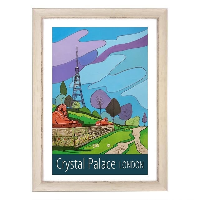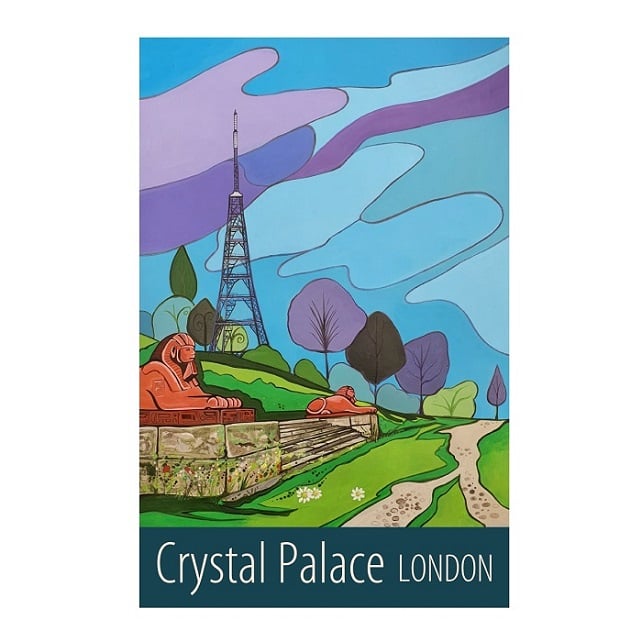 A contemporary travel poster style print of the famous transmitter and sphinxes on the Terraces in Crystal Palace Park, London, from my own original acrylic painting.