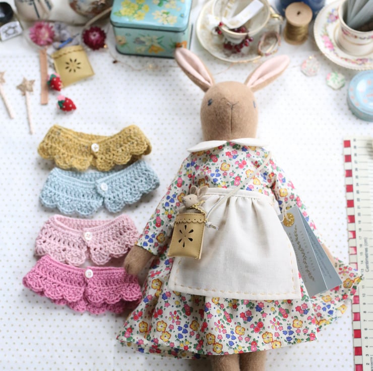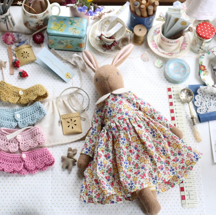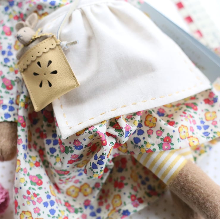 Her accessories include a tiny leather bag, hand punched with a daisy design and containing a baby bunny with a ric rac tie.