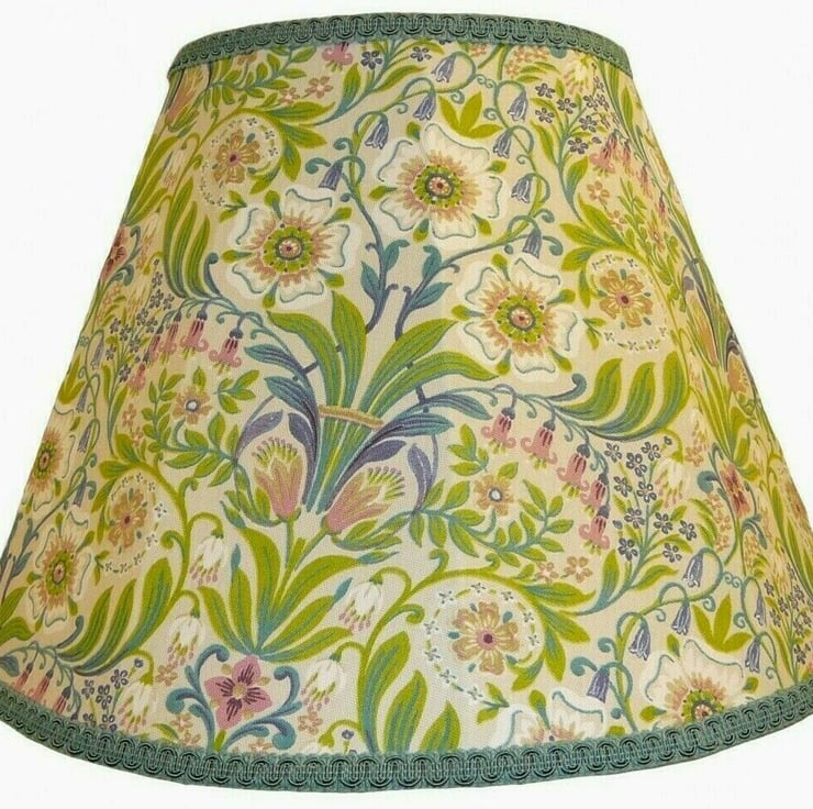 A beautiful contemporary lampshade bespoke handmade in our designer cream William Morris fabric, decorated with our complimentary duck egg blue braid, also fully lined on the inside in our inner lining fabric.
