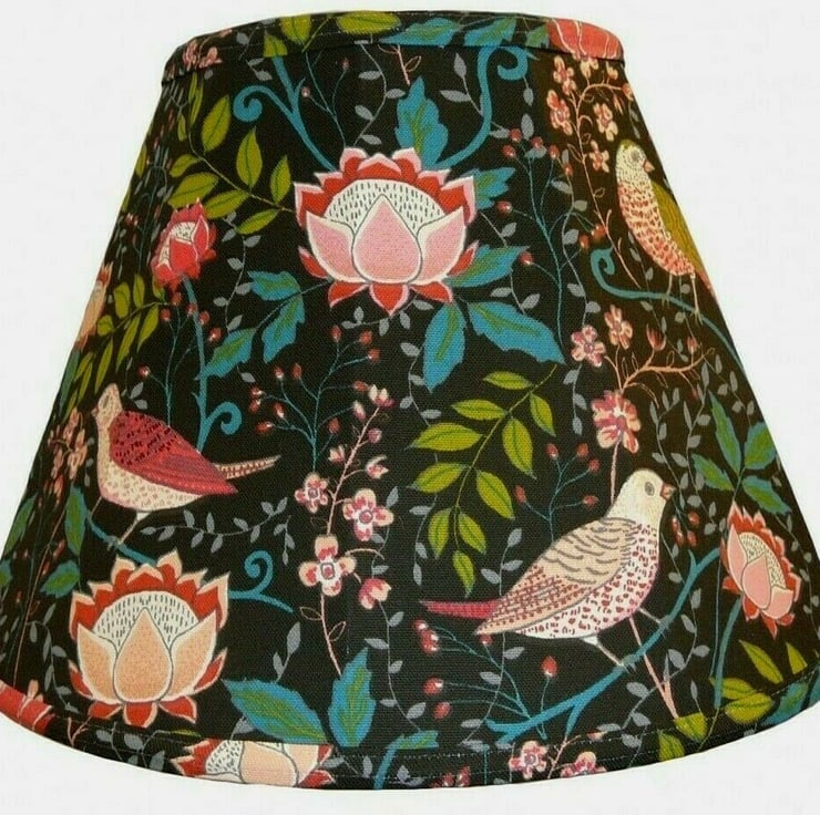 A beautiful contemporary lampshade bespoke handmade in our designer strawberry thief William Morris fabric, decorated with our complimentary self edged trim around the top & bottom, also fully lined on the inside in our inner lining fabric.