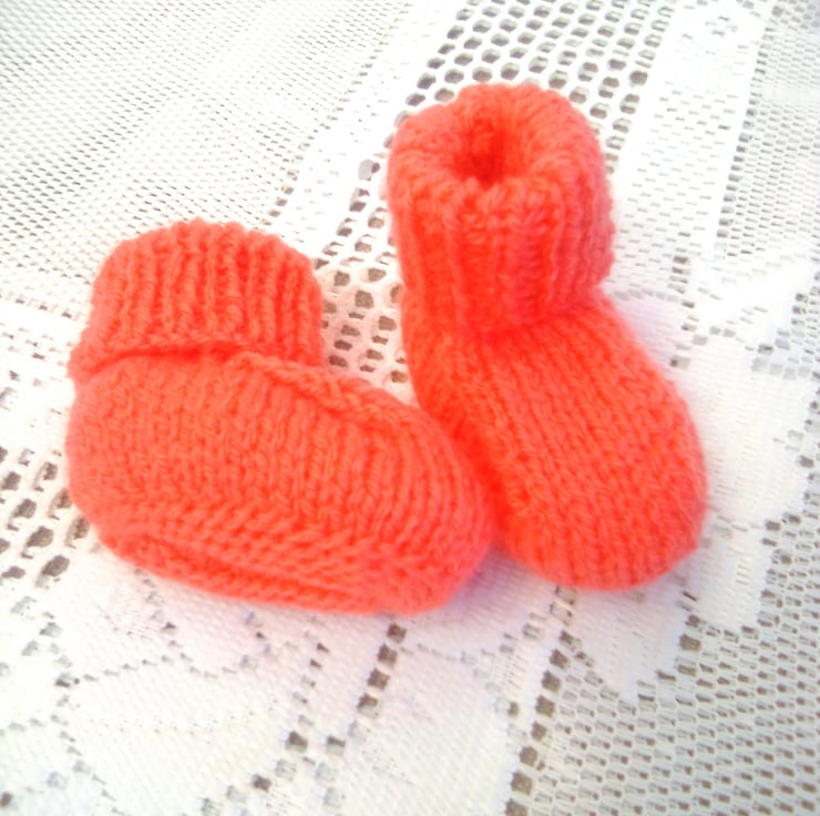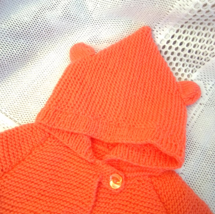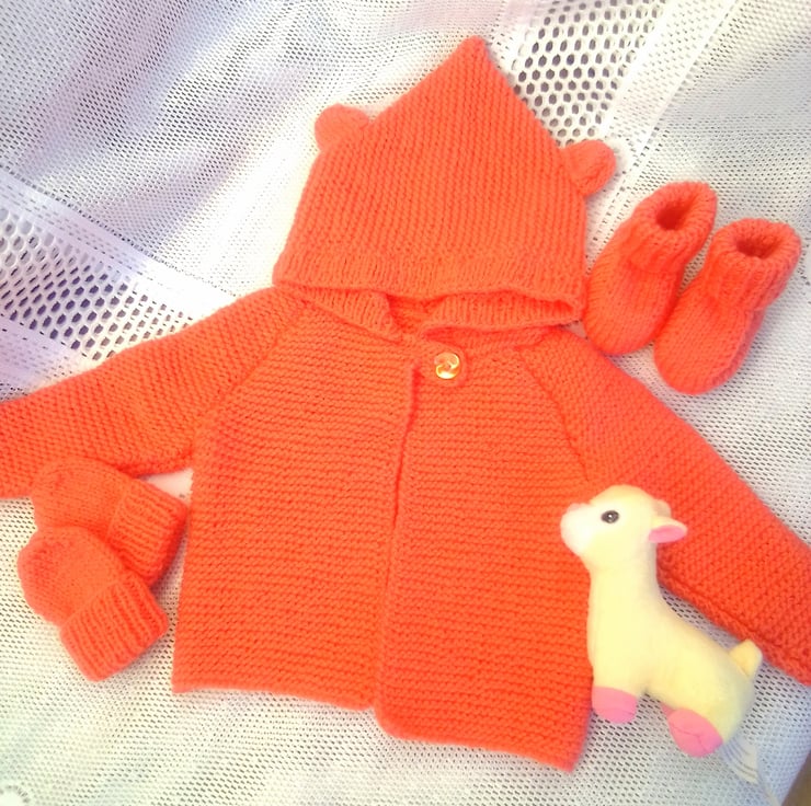 A cute hooded coat, which has ears on each side of hood, a pair of mittens and a pair of booties for a baby. The set is hand knitted in double knitting yarn in the watermelon (orange) colour shown in a size to fit a 0 - 9 month old baby with a 16" - 18" chest. This coat set can also be made for you any of the sizes shown below and in a colour of your choice. It will take 1 - 2 weeks to make and dispatch to you, please state colour(s) required when you order.