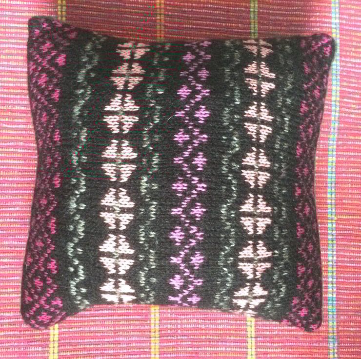 Hand knit medium size stunning fair isle wool/acrylic belnd cushalpaca / acrylic cushion cover / throw pillow. Hand knitted with a black background and pink contrast