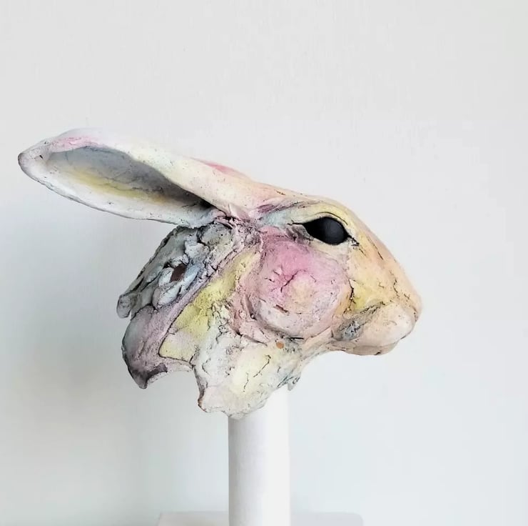 An original contemporary ceramic hare sculpture made from terracotta and porcelain clays and decorated with blended slips and stains.