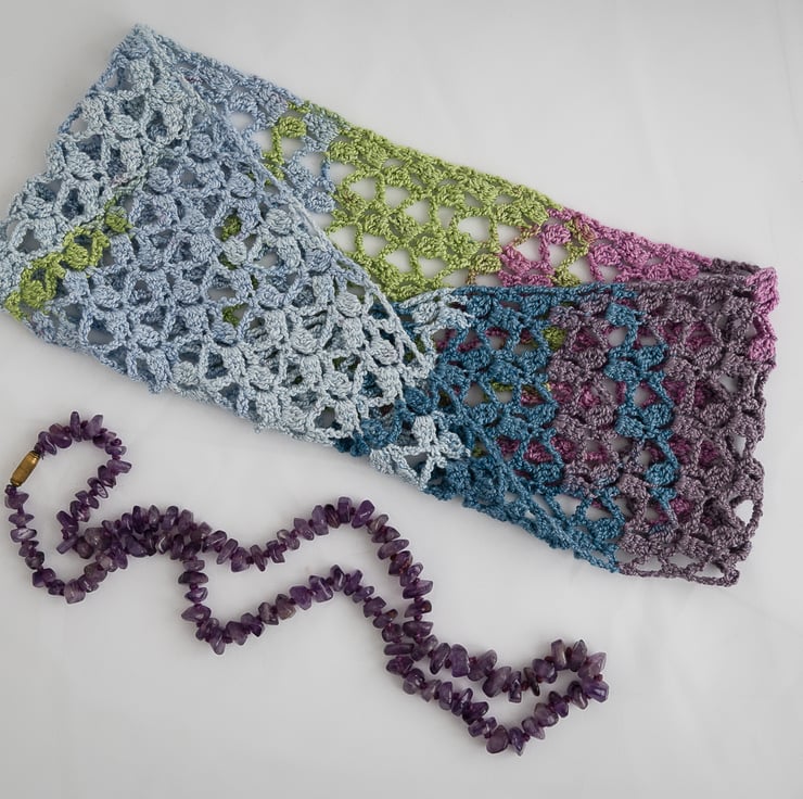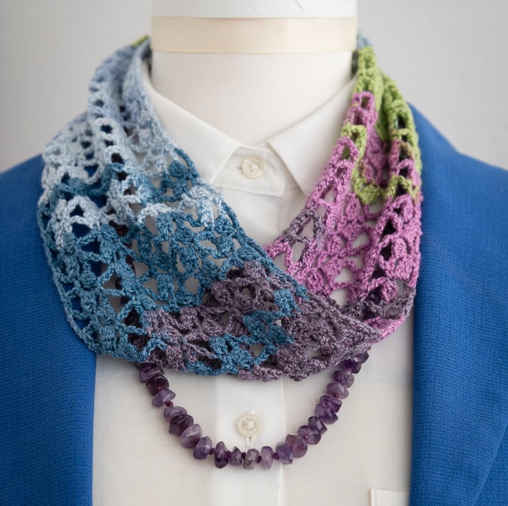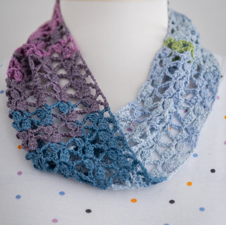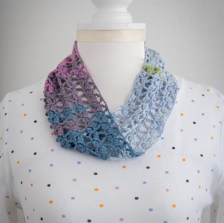 This sweet mini circle scarf is a pretty blend of blues, purple, green and pink in a lightweight summer yarn; making it a stylish neckline accessory for spring/summer. The yarn is mainly composed of bamboo and cotton fibres and is luxuriously soft, with an interesting wavy texture. The scarf loop incorporates a twist which adds an extra chic touch to the way it drapes round the neckline.