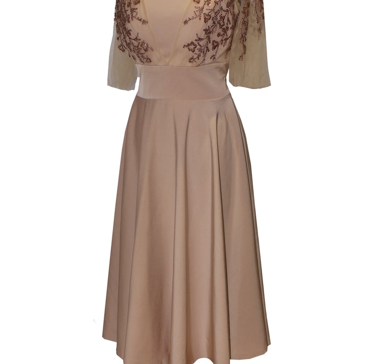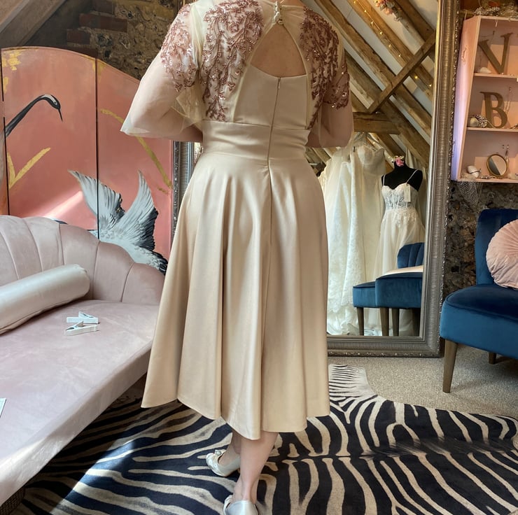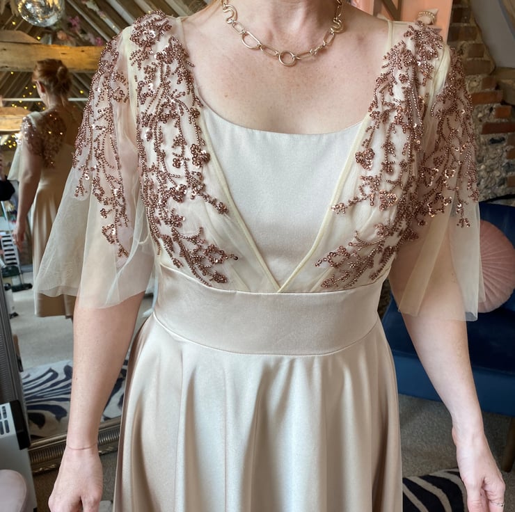 Crepe unique mother of the bride dress, mother of the groom dress. This dress can be made in any colour and size for the full price of £390. This is for a champagne/light gold and bronze dress size 12/14 dress. very flattering dress.