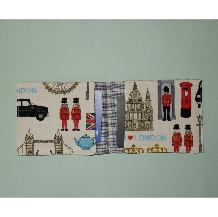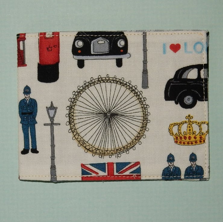 This card wallet would make a great gift for for lovers of London. It features the millennium wheel, black cabs, policemen, post boxes and St Paul's cathedral. The wallet is ideal for travel cards, Oyster cards, bus pass, train tickets and credit cards. It measures approx. 3.5 x 3 inches folded and 7.5 inches open. It is made from cotton fabric, and lined in a toning check fabric.