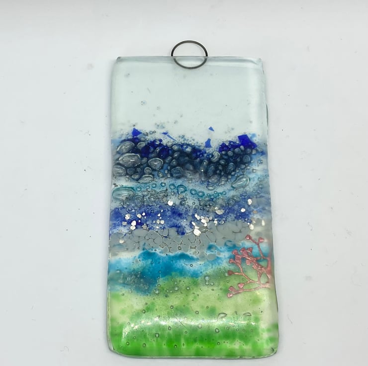 This is a beautiful handmade decorative landscape suncatcher. It is handmade using glass, with a range of blues and greens.This would make an ideal gift for a loved one.
