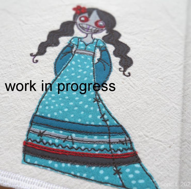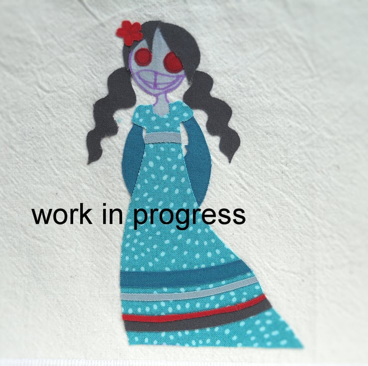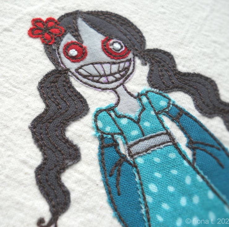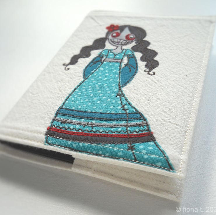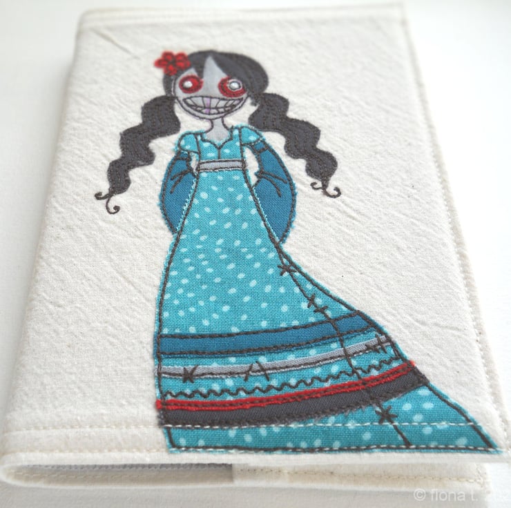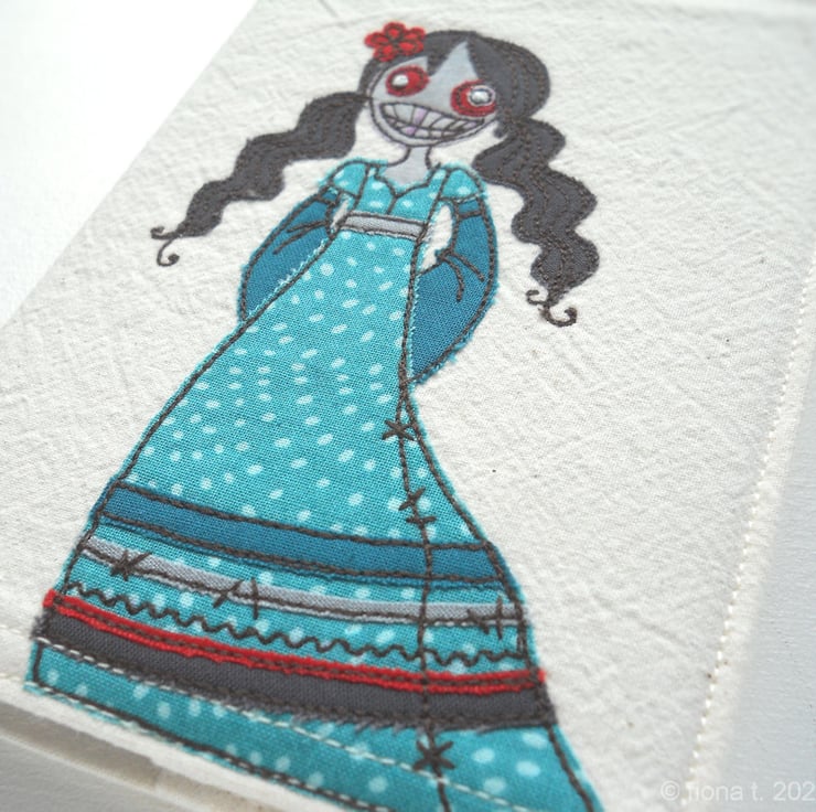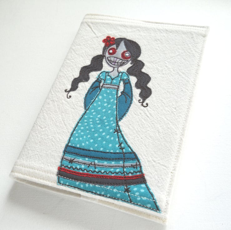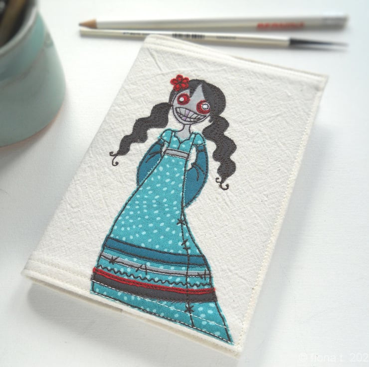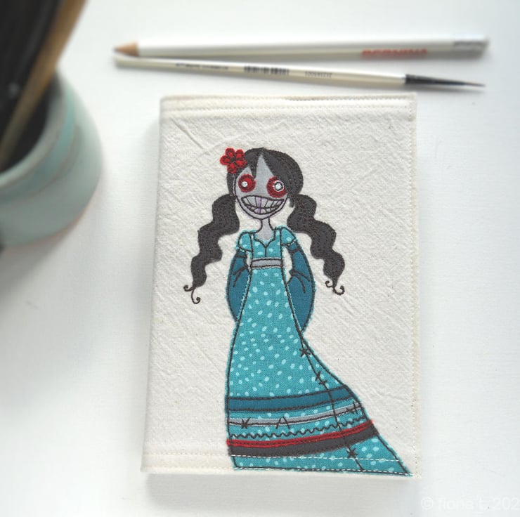 applique & freehand embroidered zombie lady notebook cover with A6 sketchbook inside.