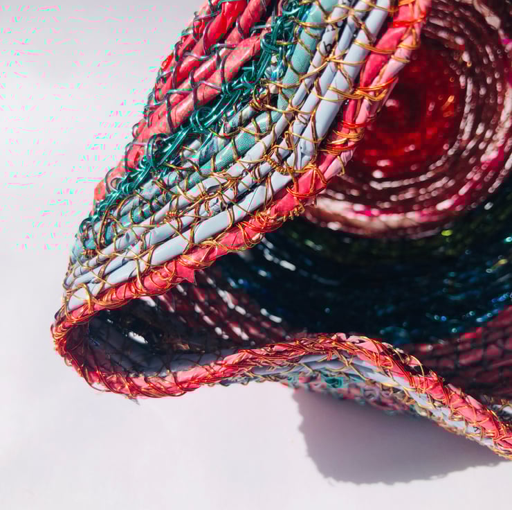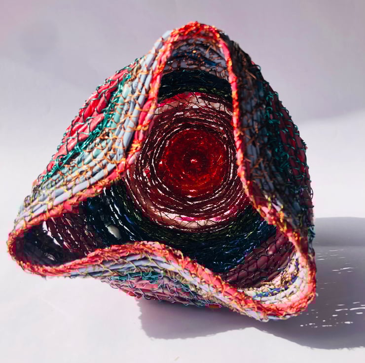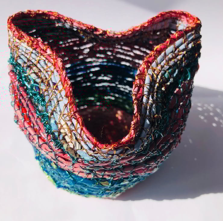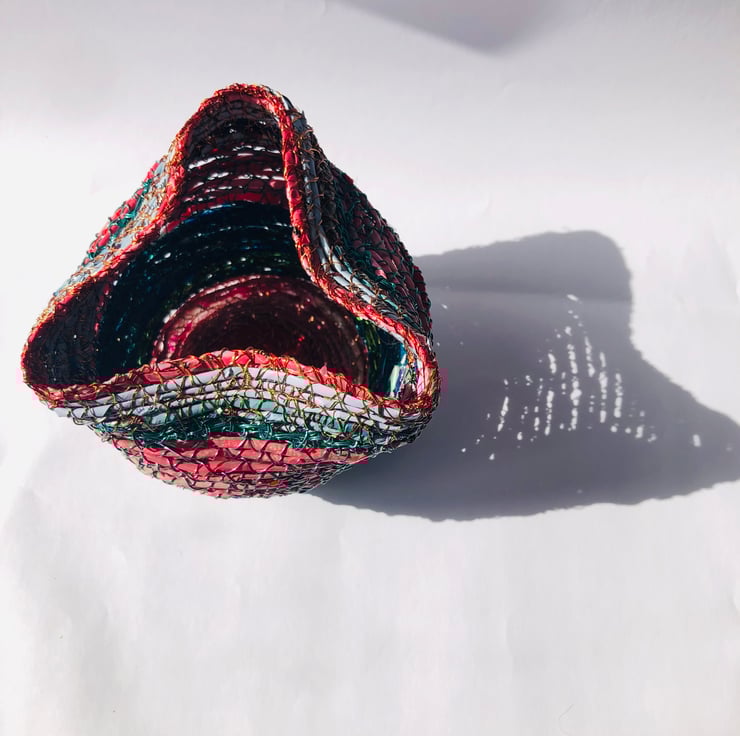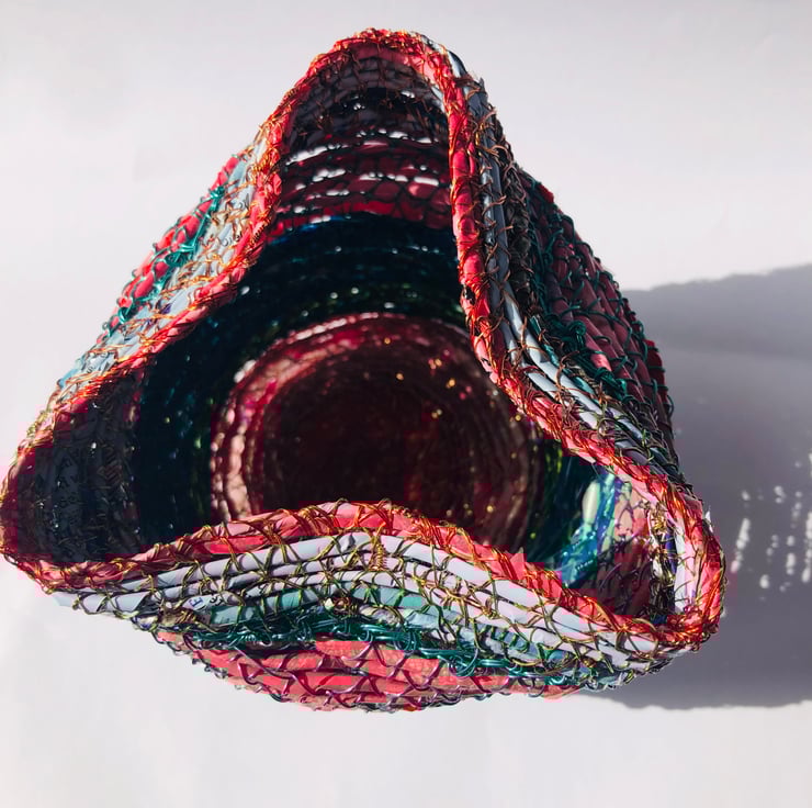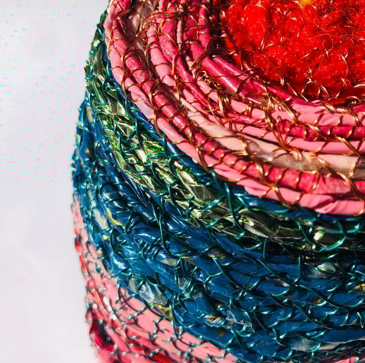 plastic wrappers from bags of coffee beans/bunches of flowers, plastic netting from tangerines, and bought urquoise wire. Each coil pot is made with no plan and evolves as I construct and as the raw materials present themselves. Each piece is made by hand and many hours going into their creation. I use textile techniques in metal ton construct the structure and "textile" at the same time. 11 cm x 11 cm