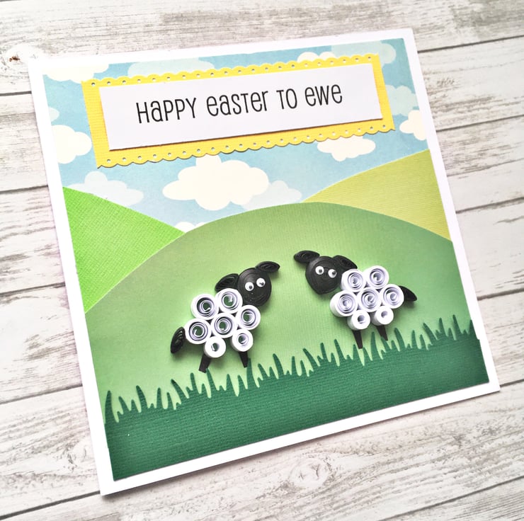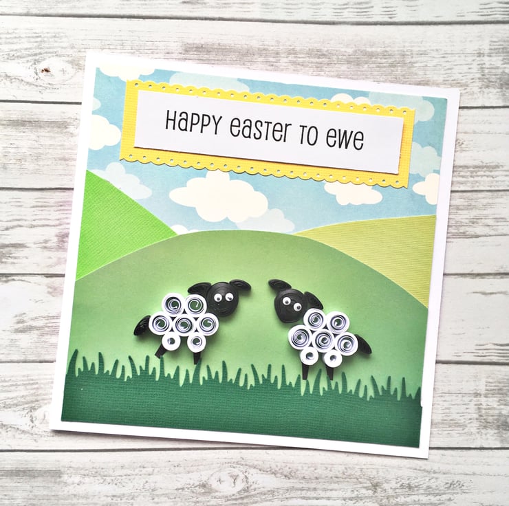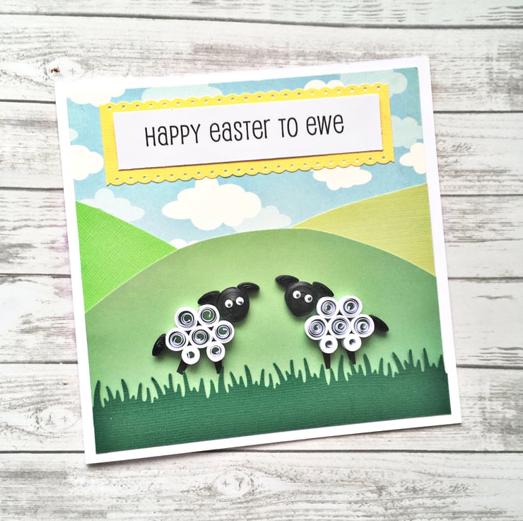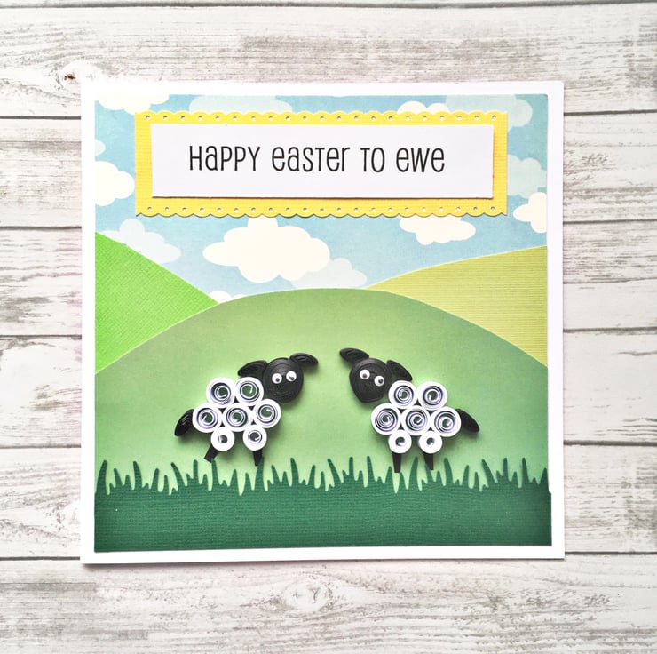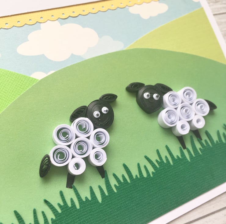 A bright and whimsical hand-quilled Easter card featuring two sheep made with quilled white paper coils enjoying a sunny spring day on the hills. Their heads and ears are also quilled in black, and googly eyes give them some added personality.