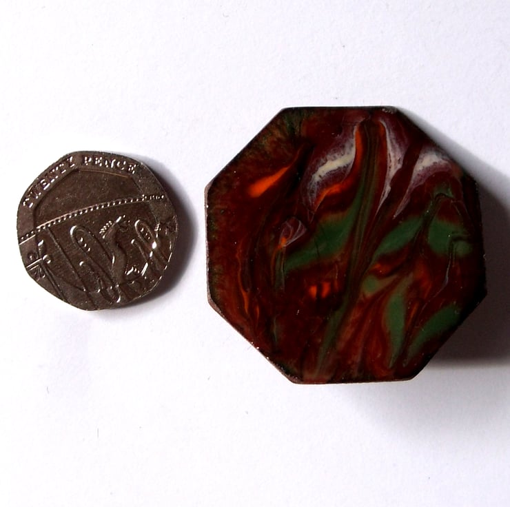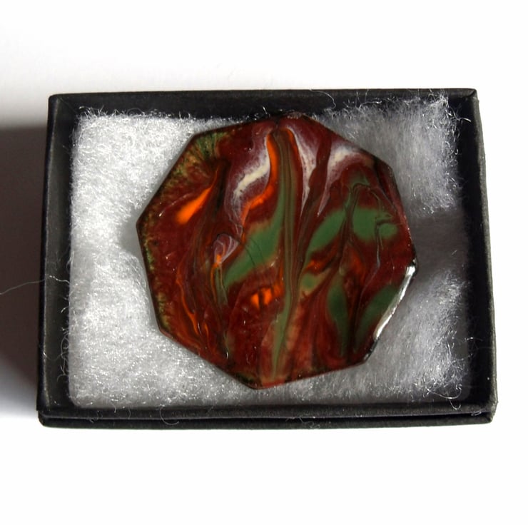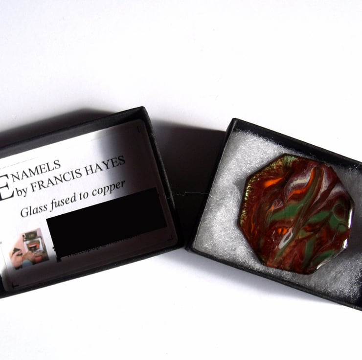 This brooch is based on a copper octagon on which I have built up several layers of clear enamel, then fired a layer of red-brown enamel over this base. After that, I added scatterings of orange, green and white enamel through which I drew a steel point when the piece was red hot, to make the unique, random pattern.