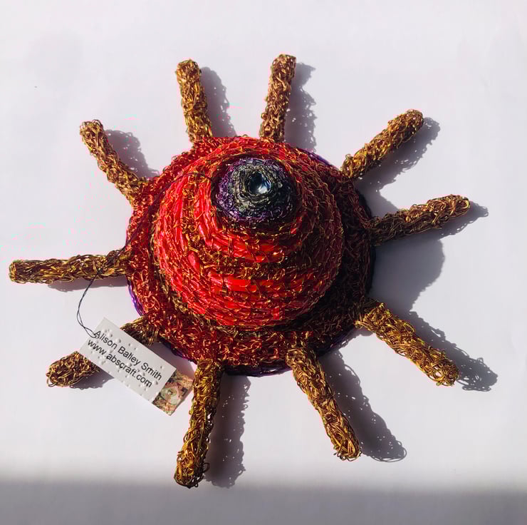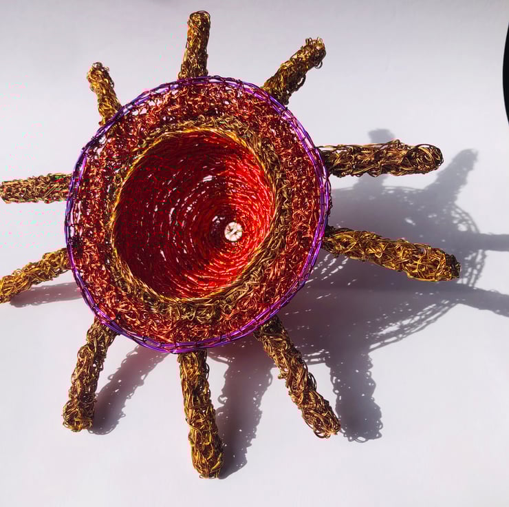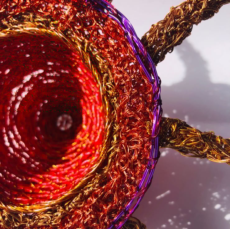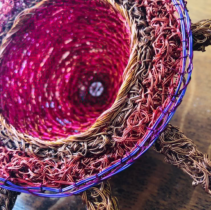 Cartwheel basket made from recycled materials - wire reclaimed from televisions, the red plastic ribbon used at the launch of The Green Gallery at the Williamson Art Gallery & Museum, toothpaste tubes, school shirt button and bought purple wire. Each piece is made by hand and many hours going into their creation - this one took years as it was originally designed as a statement bangle and I recently added the pot to change its purpose when I was working at the Williamson as press officer and voluntary community engagement officer. I use textile techniques in metal, wrapping, rolling and overstitching with random knotting.