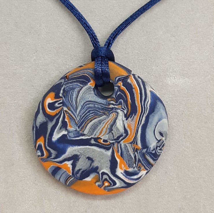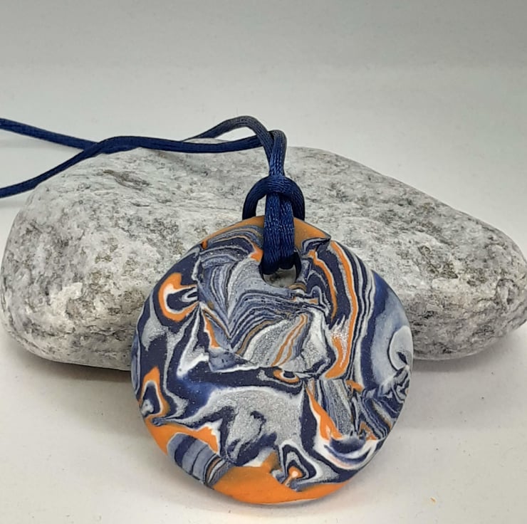 A handmade pendant made from a blend of navy, orange, silver and white polymer clay in a unique swirl design to create a circular pendant measuring approx. 43mm deep x 41.8mm across.