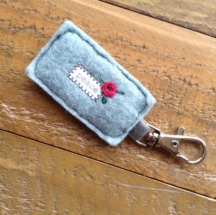 I have embellished a piece of felt with Liberty fabric, lace, a silver metal peace dove charm and an embroidered button meadow. On the back is a label with "peace" printed on it and an embroidered rose. The fob is attached with velvet ribbon. Measures approx. 3.5 x 5.5 cm. - not including loop and fob. Comes with gift bag and tag as shown.