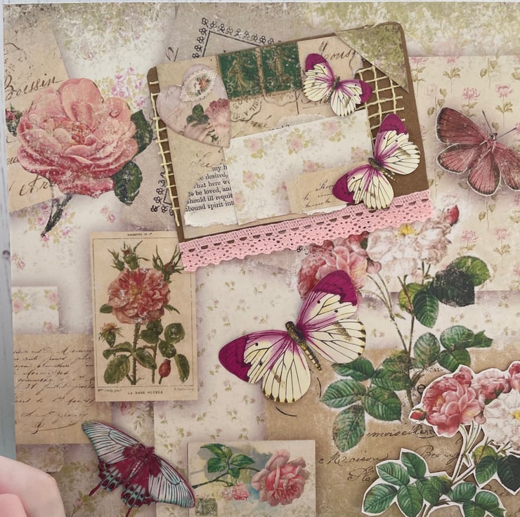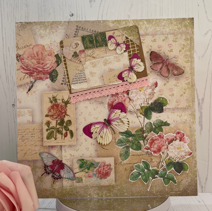 An 8 x 8” white card and envelope. Backing paper a collage of vintage style, roses, postcards. Topped with hand cut butterflies and flowers. A snippet mounted onto Kraft card with a mini collage of paper butterflies, heart and stamps.