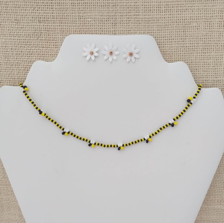 I made this cute 16" bee necklace using quality glass seed beads in black, yellow and white. I finished with a silver plated toggle clasp.