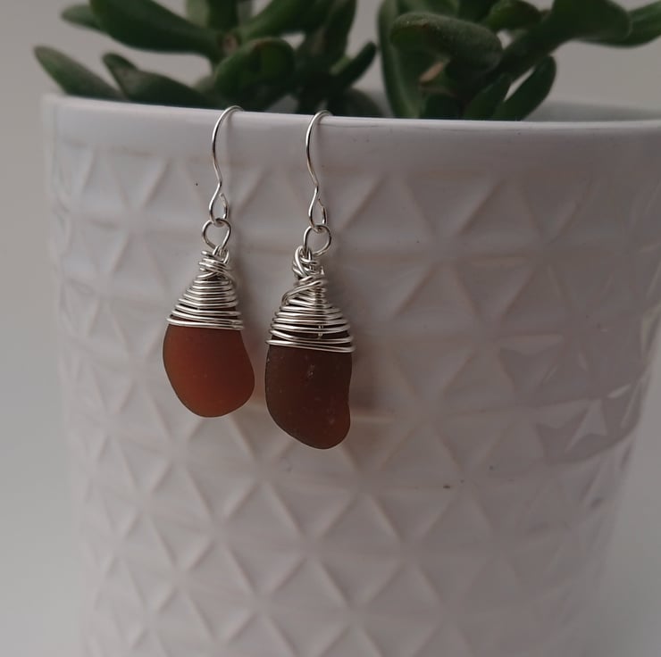 Deep Amber Cornish Sea Glass Earrings, Sterling Silver E500