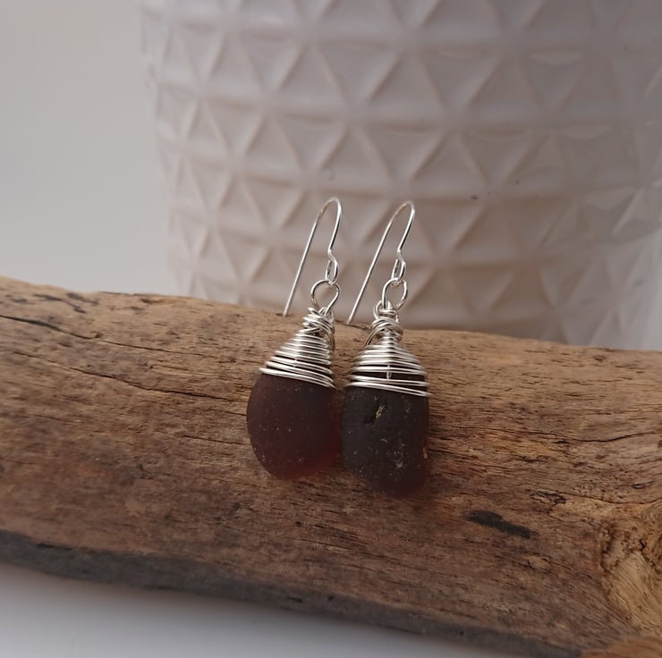 Two beautiful little pieces deep amber Cornish sea glass, wire wrapped in silver wire.