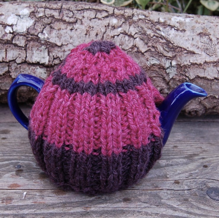 The tea cosy has been knitted using a rib pattern making it quite stretchy. It will fit the one cup tea for one tea pots.