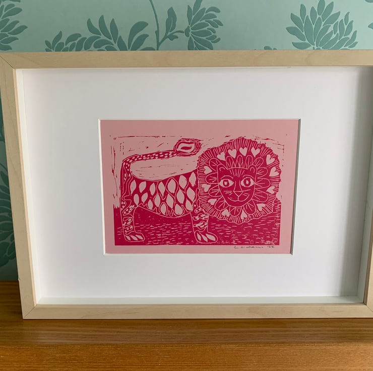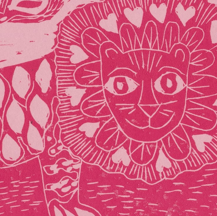 I love naive style of art and folk art. I often doodle images and like to fill them with pattern. I was being a little cautious when drawing this character then I stopped myself and drew the lion directly onto the lino instead of tracing the original image. I have printed this lion in a few different colours but only one pink version.