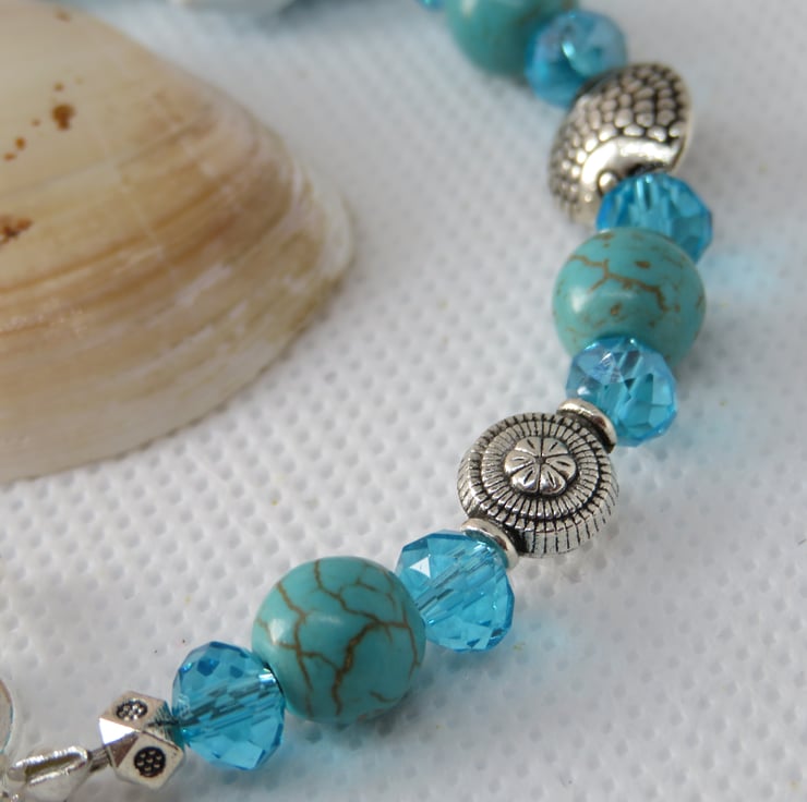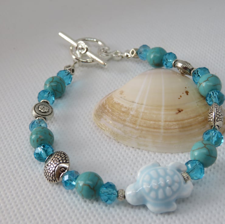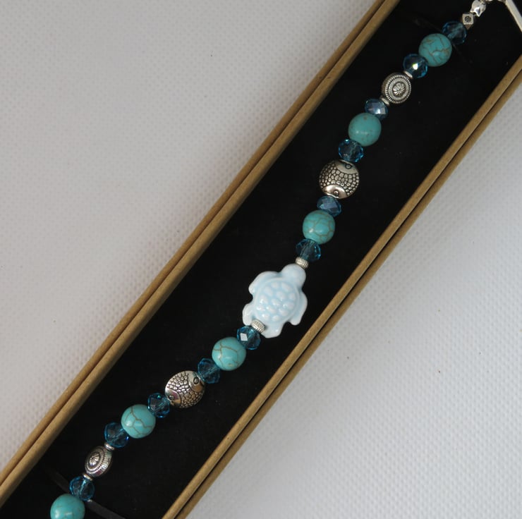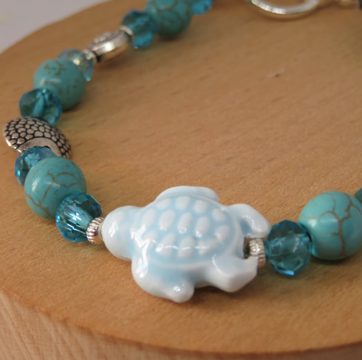 Love this little ceramic turtle and it seemed to make sense to surround him with turquoise and sea-themed tibetan silver, so he feels at home. I am saying 'he', but could just as easily be a she in this very wearable bracelet!