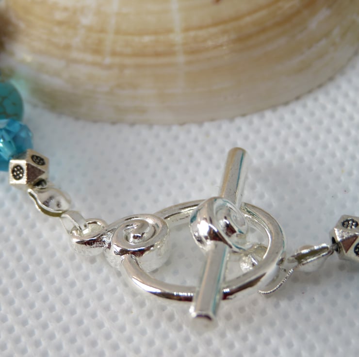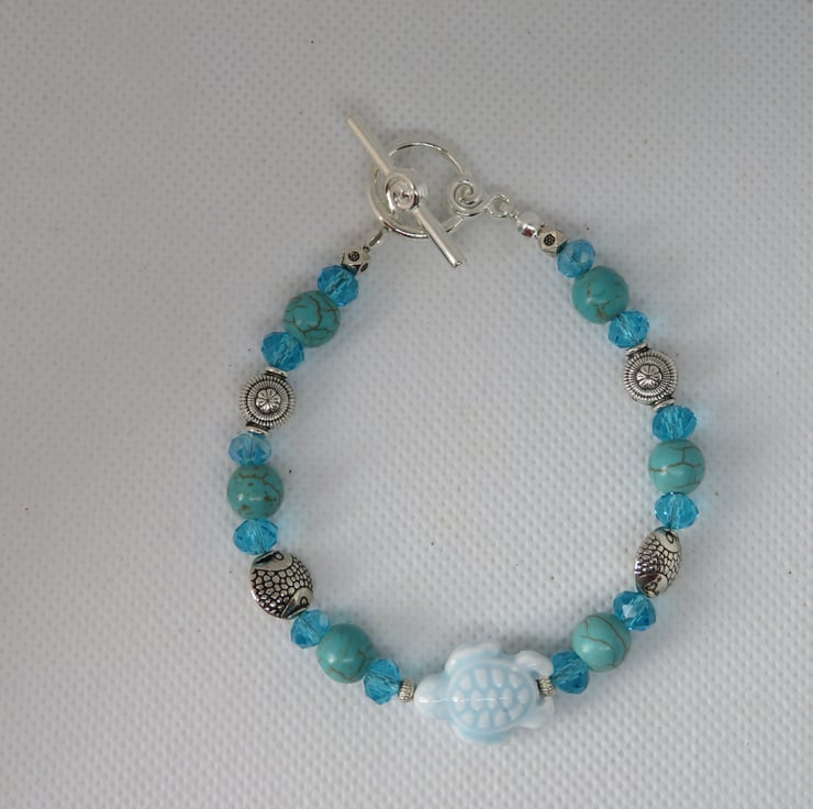 A cute ceramic turtle sits in the centre of this bracelet and is surrounded on both sides by turquoise glass rondelles, 8mm turquoise beads and tibetan silver beads. All securely threaded onto tigertail wire and fastens with a silver plated spiral pattern toggle clasp.