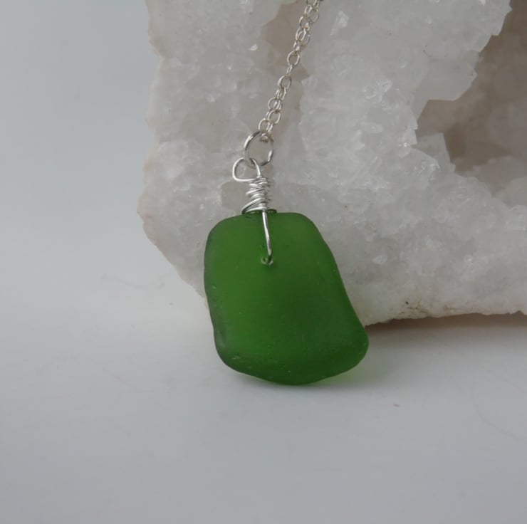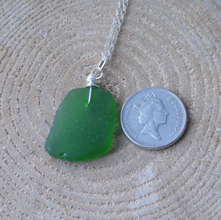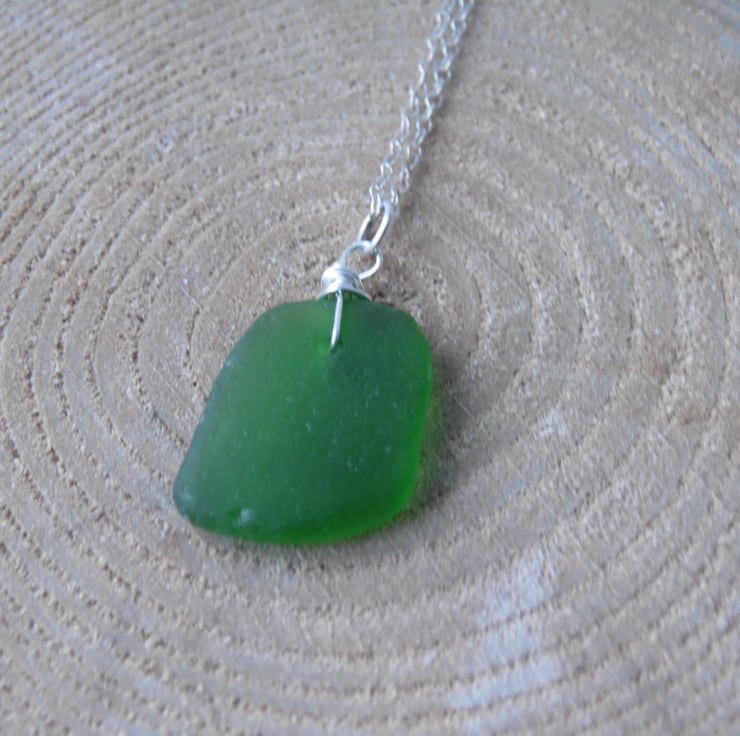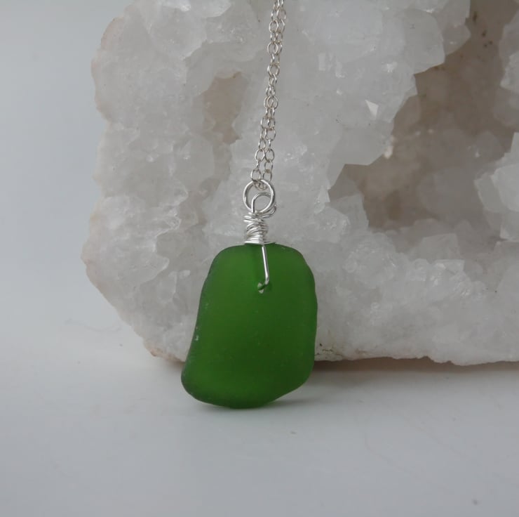 A beautiful piece of bright bottle green Cornish sea glass wrapped with silver wire.