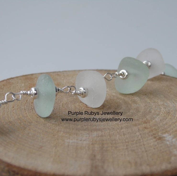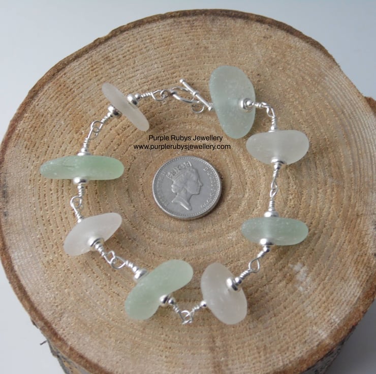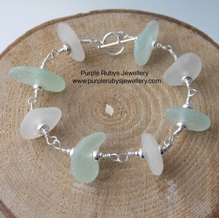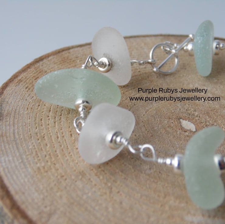 A gorgeous bracelet made from 8 pieces of Cornish sea glass in soft seafoam & white tones. Each piece of sea glass is paired with silver beads and connected with silver wire; fastens with a silver toggle clasp.