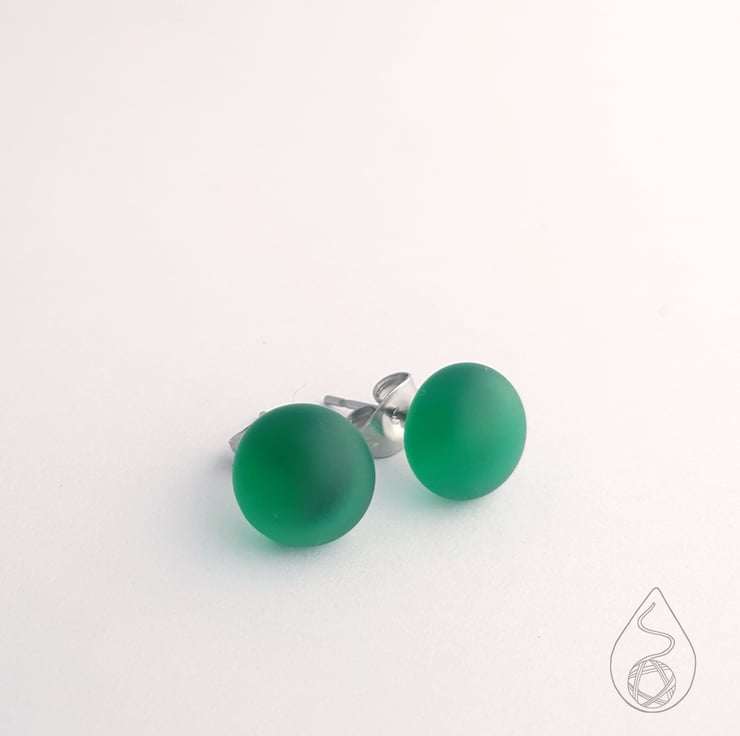 A pair of fused glass stud earrings in a frosted emerald green.