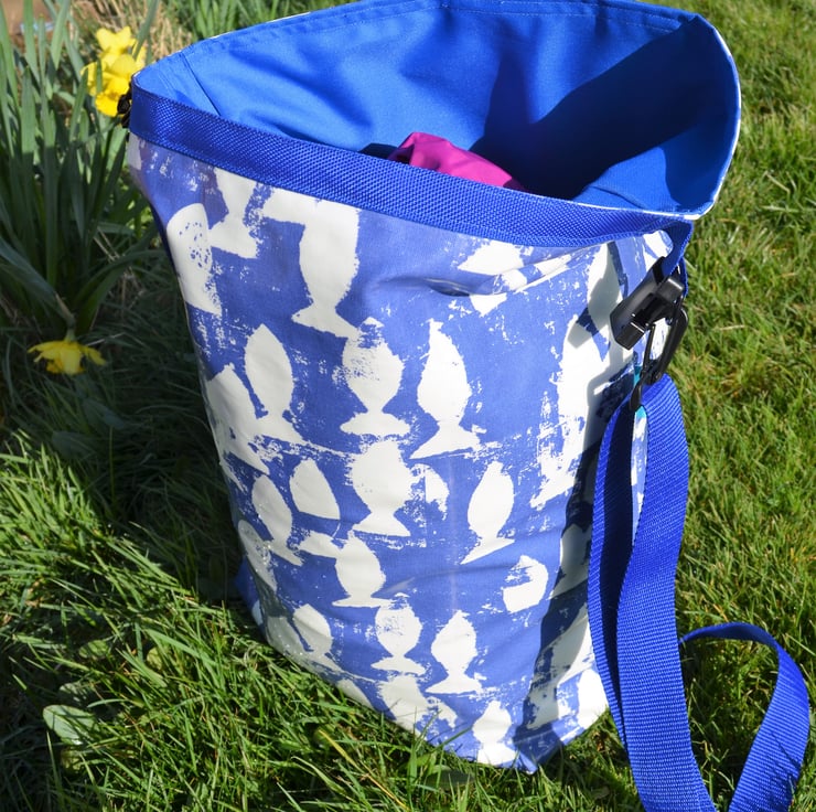 NB The fish might be swimming in a different direction, this one shows them swimming up! This extra large size oilcloth fabric rucksack is ideal for cramming everything you might need for a trip to the gym, swimming pool, beach or a wild swim. It's big enough to fit in a dry robe, towel, wetsuit, swim suit, boots gloves, mask, hat, float and has a sewn in large pocket to separate your wet from your dry once you have had your swim or to keep your valuables together. The outside is in a lovely shiny blue and white fish quality oilcloth. The lining is 100% polyester lining water-resistant fabric in a contrasting royal blue and I have waterproofed all of the seams. The design is based on a traditional 'dry bag'. The fully adjustable, rucksack straps make this bag easy to carry and also to hang up. The straps are in contrasting royal blue colour. Just squash everything inside, expel all the air, roll down the top and fasten with the clips. It's easy to keep clean, just wipe down with a cloth- I have added a handle at the base of the lining so that it can be pulled out and hung up, it will dry super quick! Pull the lining out each time to dry to avoid mildew.