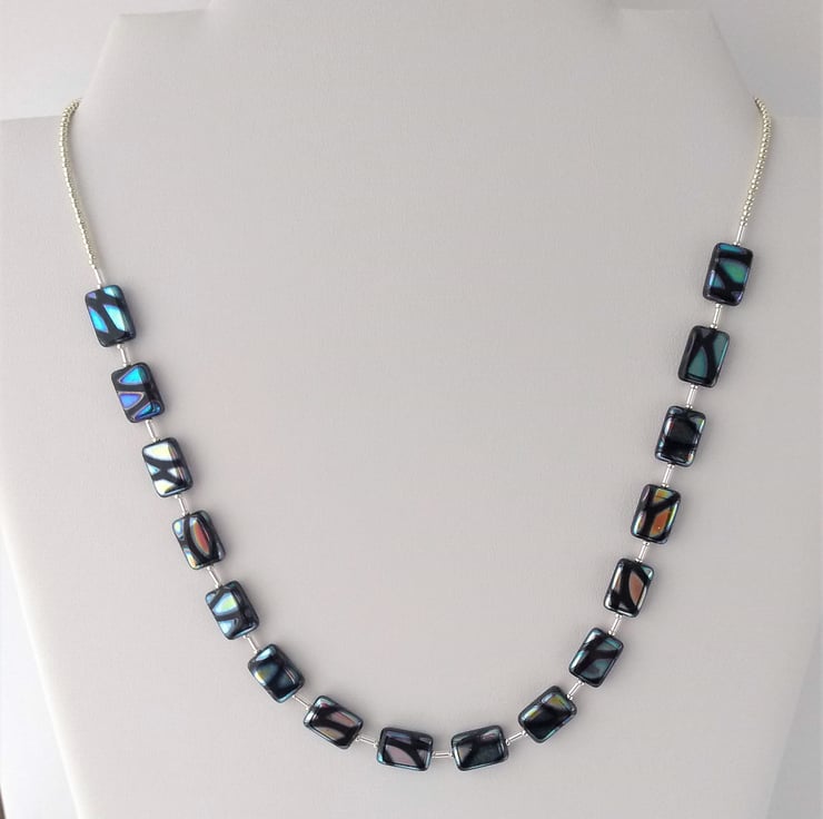 I made this 18" necklace using black multi coloured Czech glass rectangle beads with tiny silver glass beads in between. The necklace is finished with a silver plated toggle clasp and comes with a black velvet gift bag.