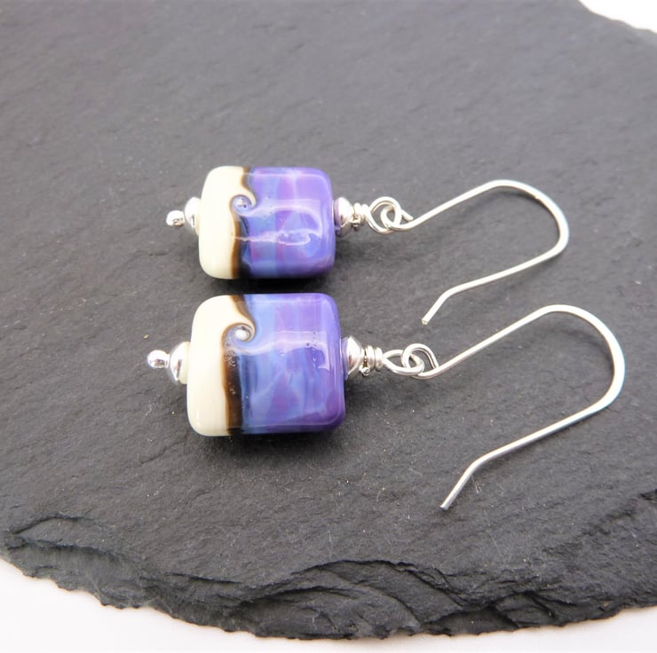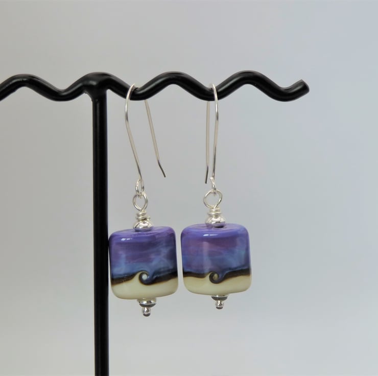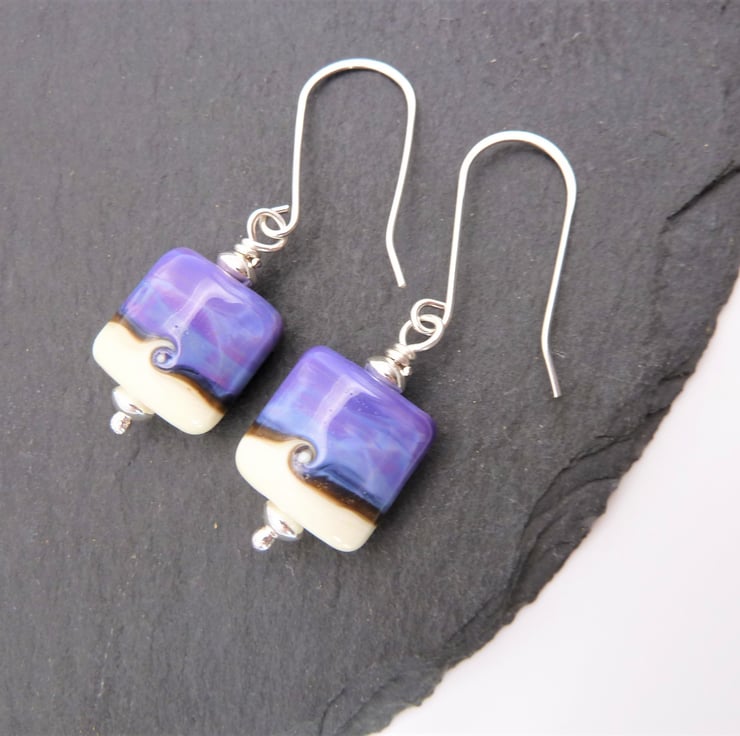 A pair of earrings made with handmade sterling silver ear wires, sterling silver beads and handmade lampwork glass beads.