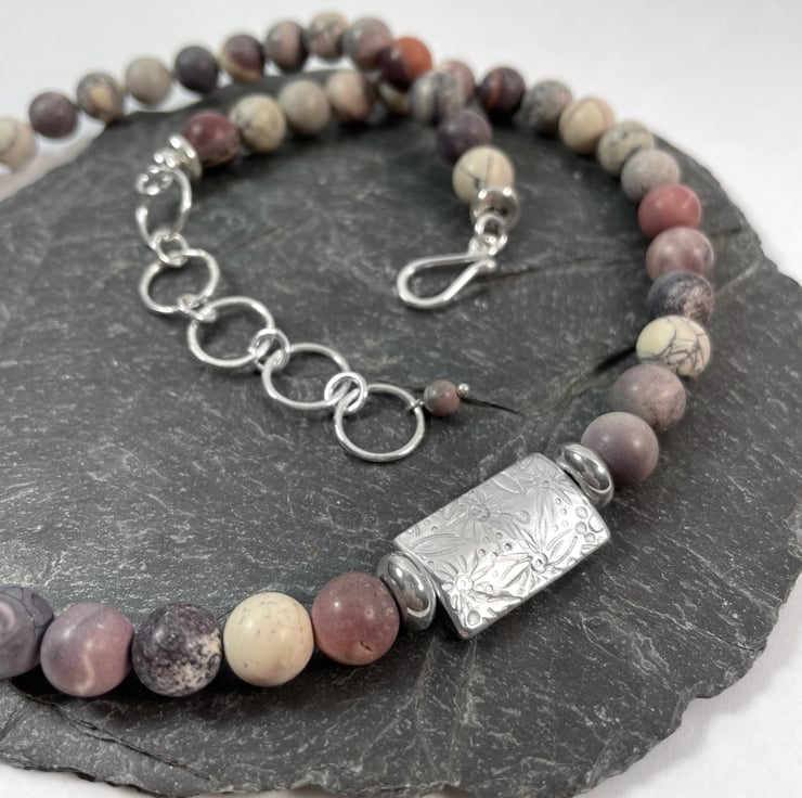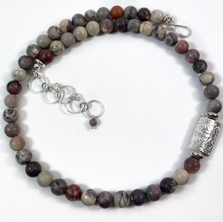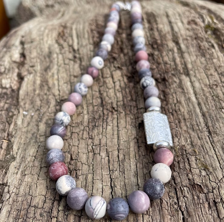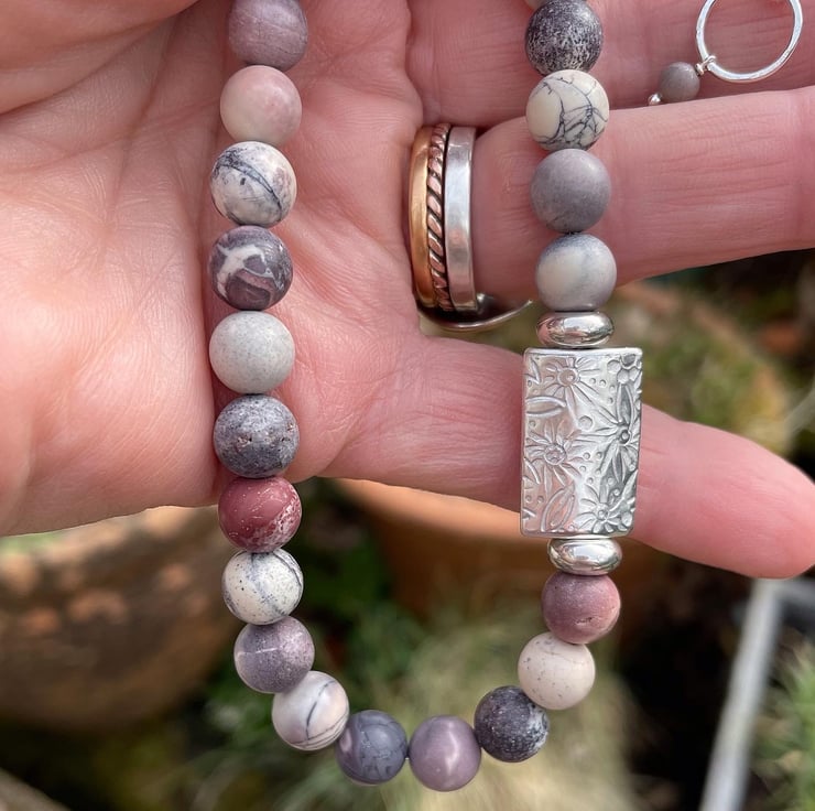 Gorgeous matte porcelain Jasper beads in muted dusky mauve and pink tones have been combined with 3 silver beads strung off to one side.