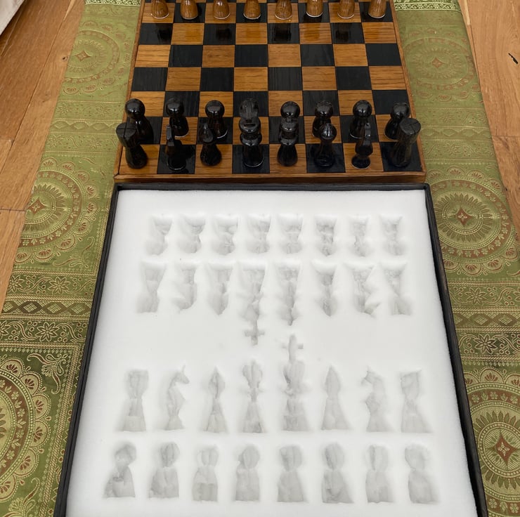 The board is the lid of the box in which the chess pieces are carefully stored in foam.