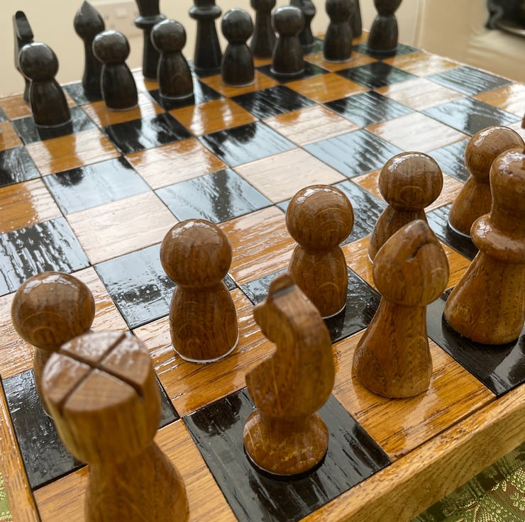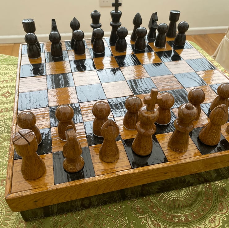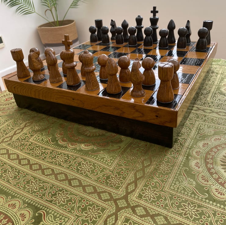 This has been hand made from recycled English oak, each piece has been individually turned on my lathe and then they and the board / box have been stained in ebony and light oak before being finished with a hard wearing varnish.
