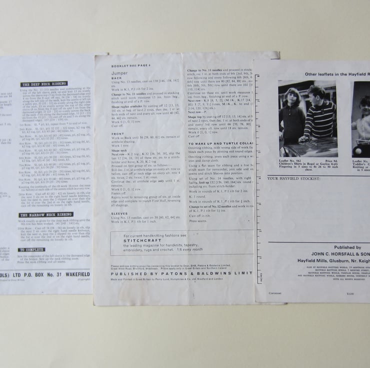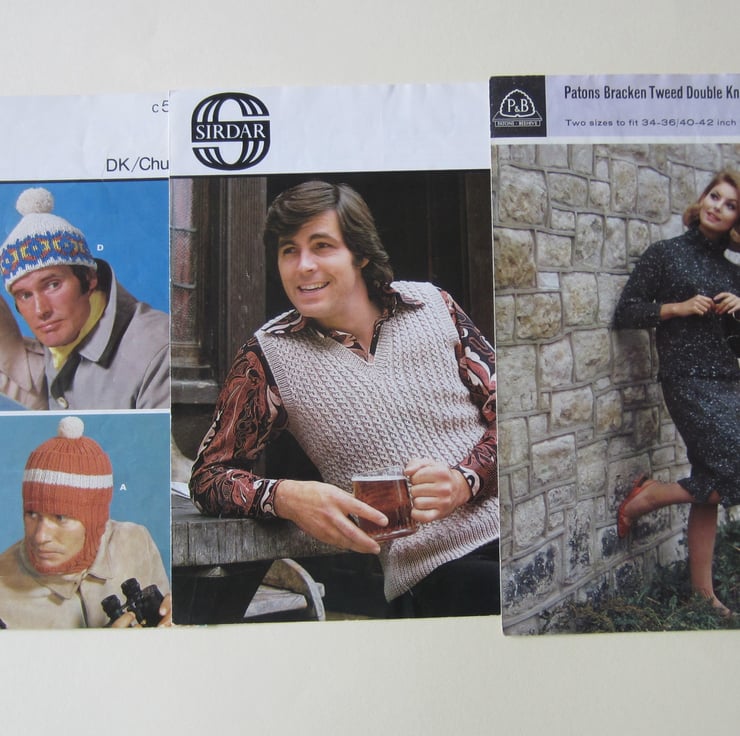 Please look at the pictures for condition. There are some marks and creases usual for patterns of this age. The Sirdar Gemini/ Chunky 6095 pattern (1st pattern in top row) has quite a large stain inside, but is still useable.