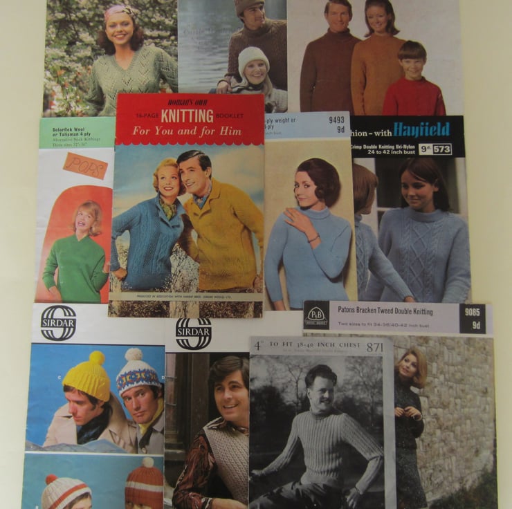 Mixed lot of 11 vintage knitting patterns for ladies and men.