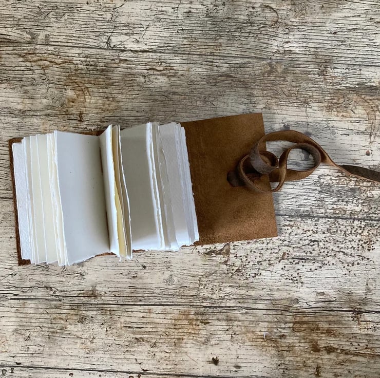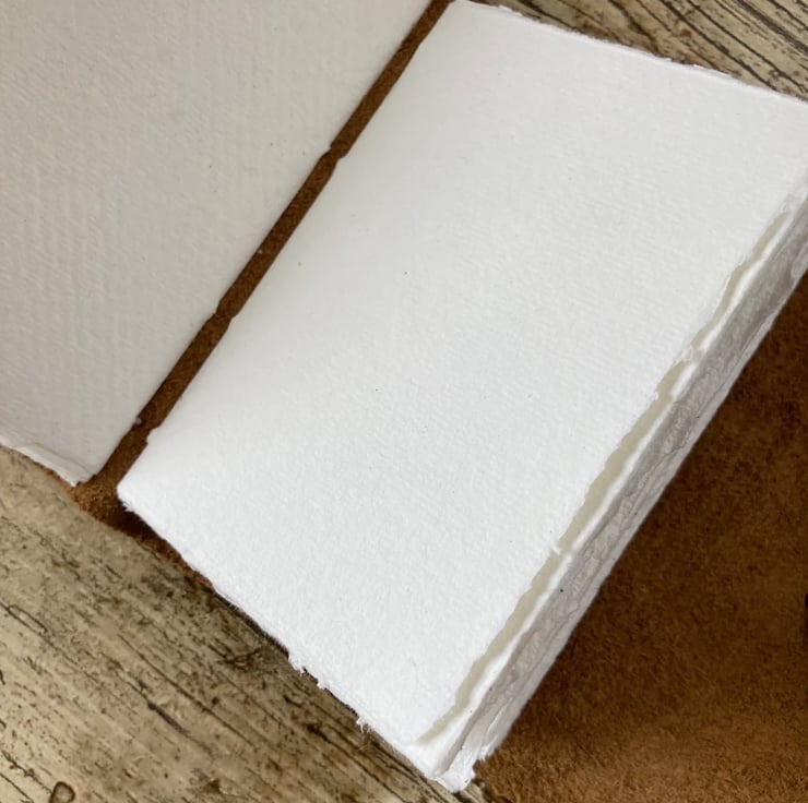 These A7 mini sketchbooks are perfect for tucking in your pocket or bag and taking out and about for art on the move! I have sourced some stunning cotton rag paper for these journals - cotton rag paper is handmade using cotton tshirt waste and retains the natural deckle from the moulds on all sides of each page, the paper is acid-free with a medium surface texture and is perfect for all drawing and painting media. Handbound in my West Sussex studio, the rustic feel of cotton rag paper pairs wonderfully with their soft leather wrap covers.