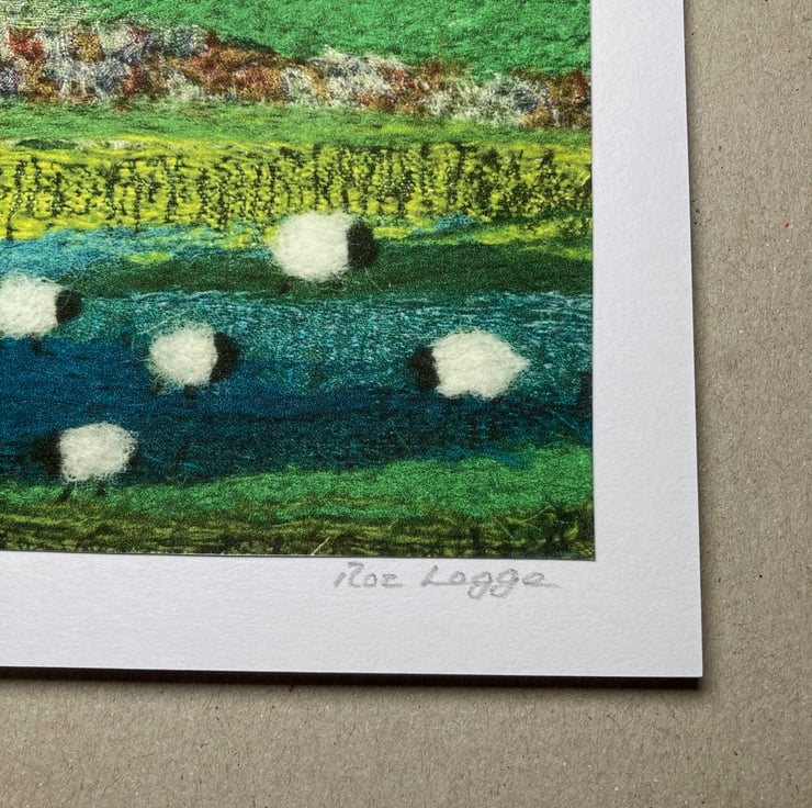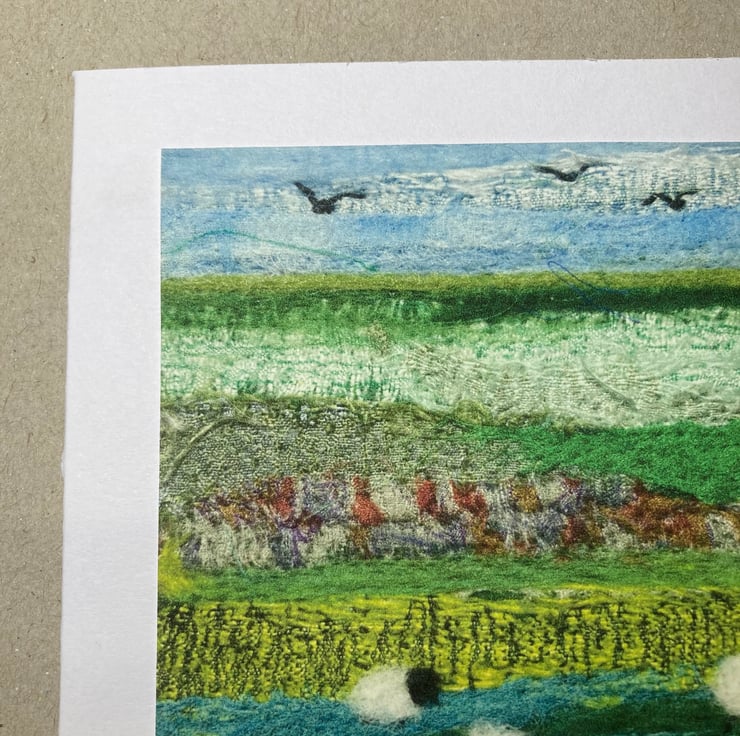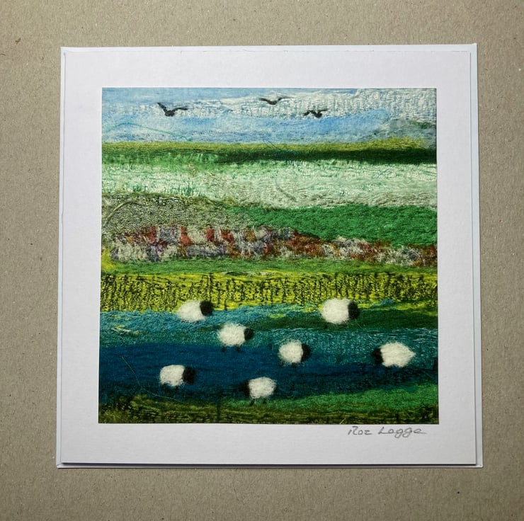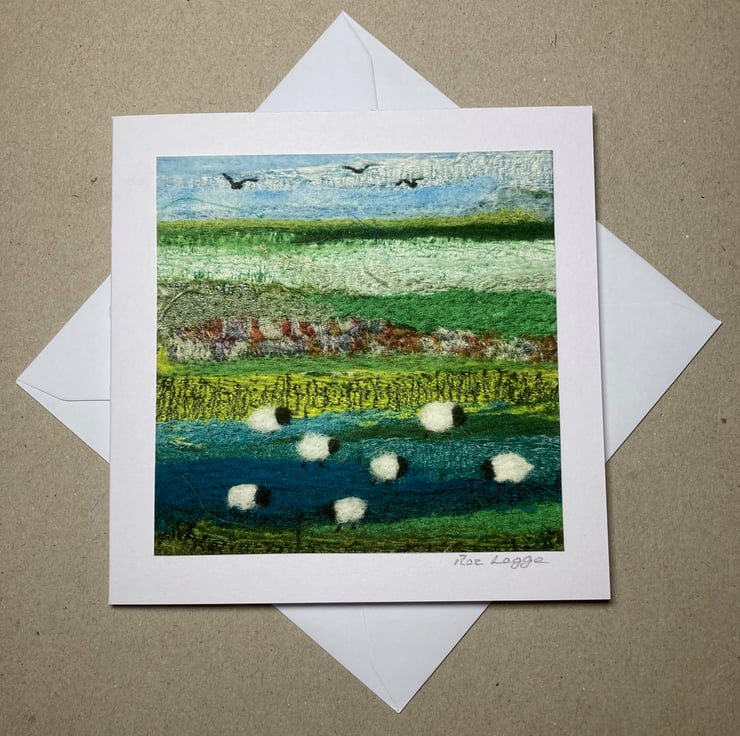 Cute little grazing sheep form the image for this card. The image has been taken from a piece of original textile art photographed and printed onto good quality cartridge paper. This print has then been mounted onto a white folded card measuring 5" x 5". The original textile art piece consists of silk fabric pieces and various silk and wool fibres needle felted together to form the picture. The card has been left blank for your own message and is supplied with a white envelope.